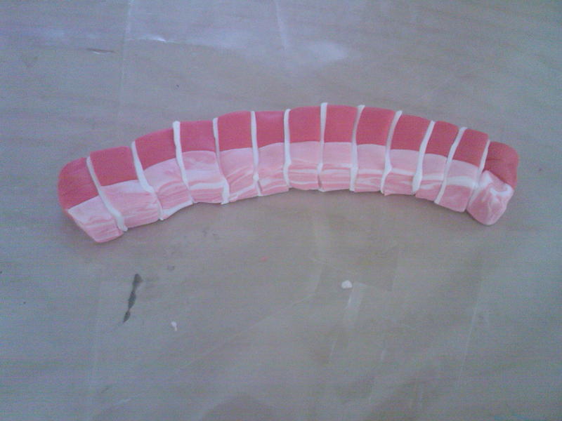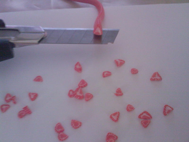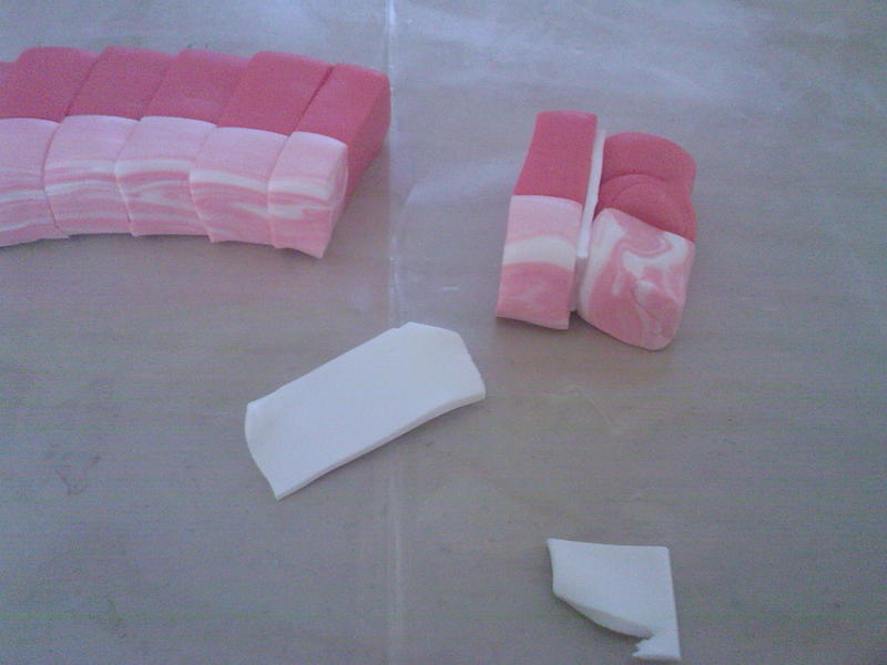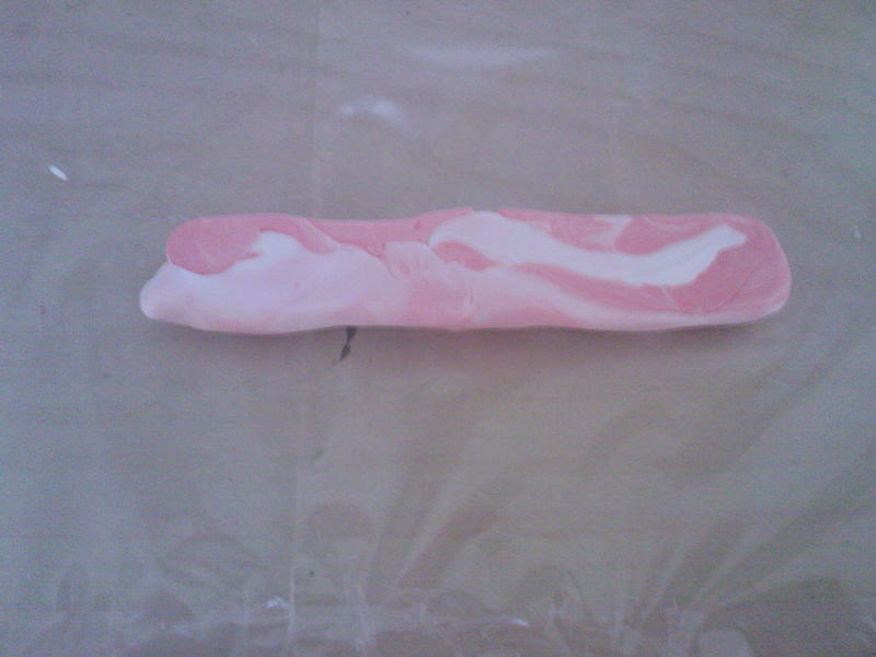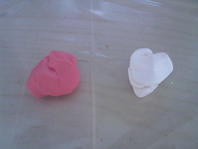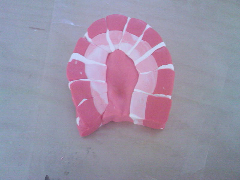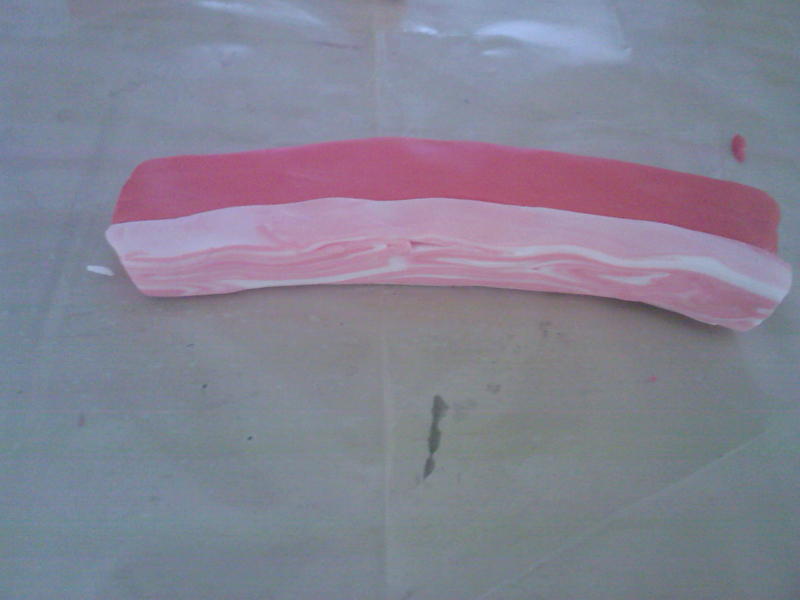 bien coller le tout et le mettre en forme de "V" et metre au centre une boule de pate ( melange transparent+rouge)