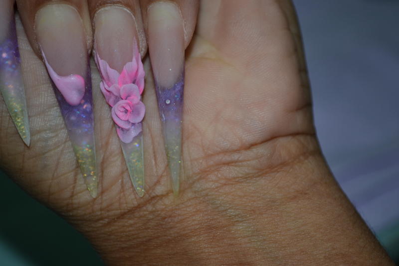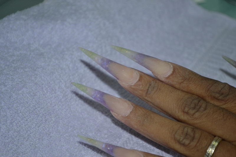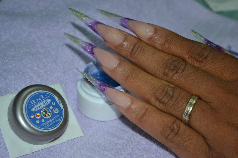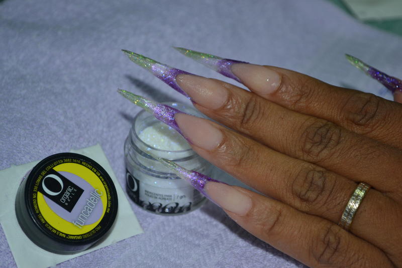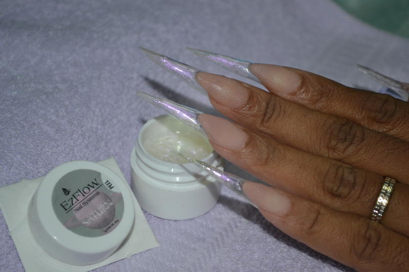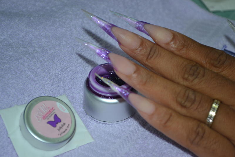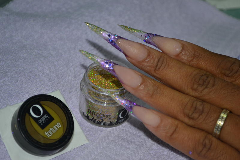 3 - mettre une fine couche de gel (comme un vernis) et mettres des tite pincées de paillettes puis catalyser