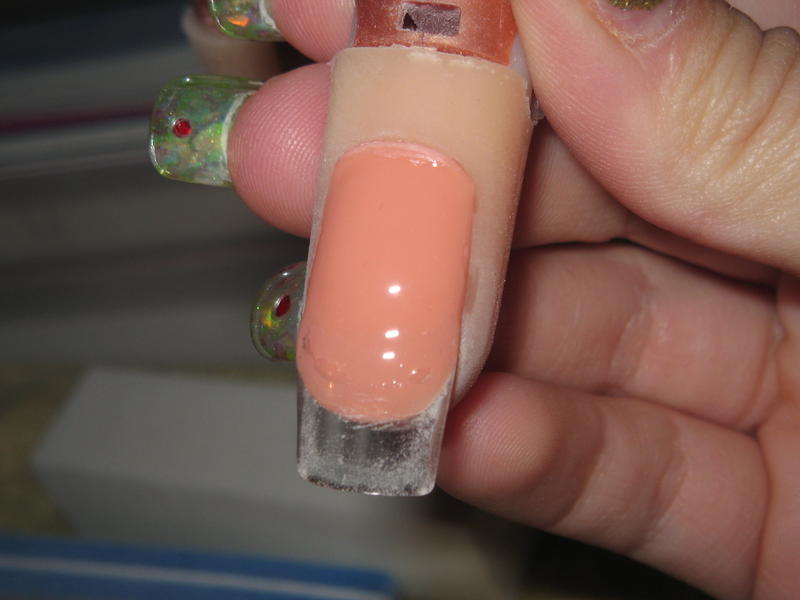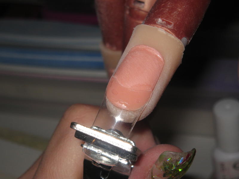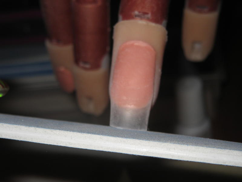 4- photo n°4 et 5: pose de la capsule (de préférence transparente pour rendre la déco beaucoup plus jolie et de cette façon là les couleurs ressortiront vraiment plus...) (ps: dsl pour les bulles d'air sous ma capsule mais pas évident de coller la capsule sur le nail trainer je m'explique je n'avais qu'une taille en caps transparente donc pour adapter à l'ongle mais il est bien évident qu'il ne faut absolument pas qu'il y est de bulles!!!!)