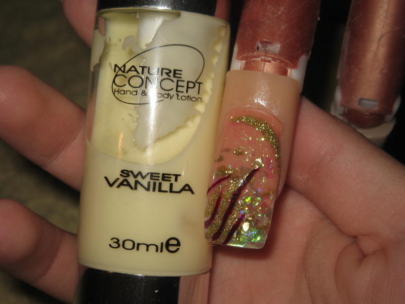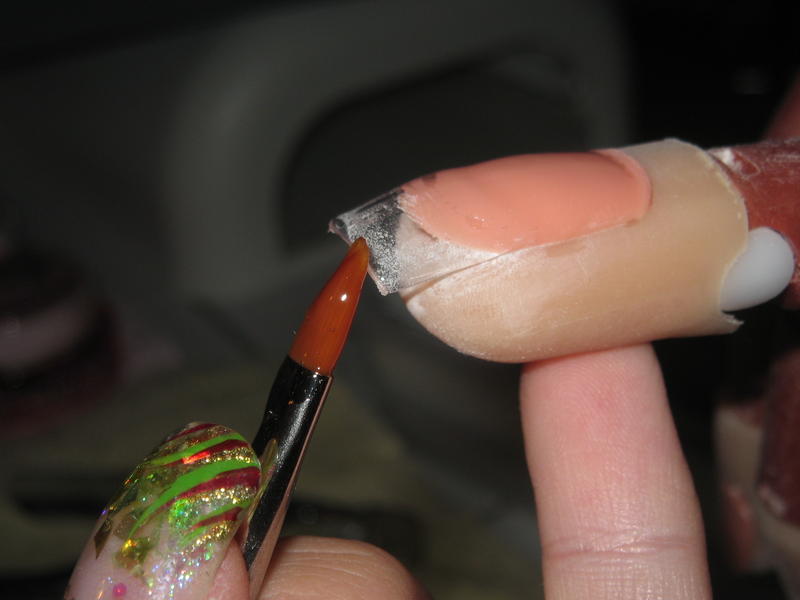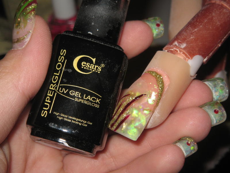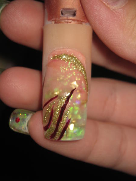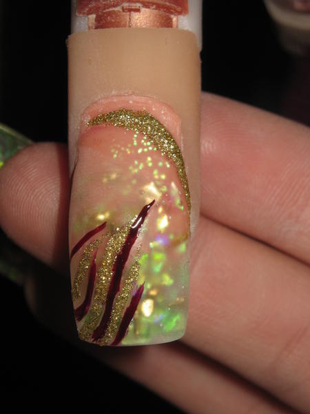 15- photo n°37 à 42: application des liners (dans mes ongles j'ai aussi du liner vert mais je n'en avait pas) donc essayer de faire des traits un peu comme des flammes (enfin tout sauf comme moi mdrrrrr!!!!!!!!!! dsl pour la qualité de mes traits qui sont très disgracieux mais j'ai fais avec du vernis^et je n'avais pas de pinceau adapté...) donc prenais bien le on pinceau si vous n'utilisez pas de liner et pour finir application de votre gel de finition (ex: gloss césars ou bien le seeling)