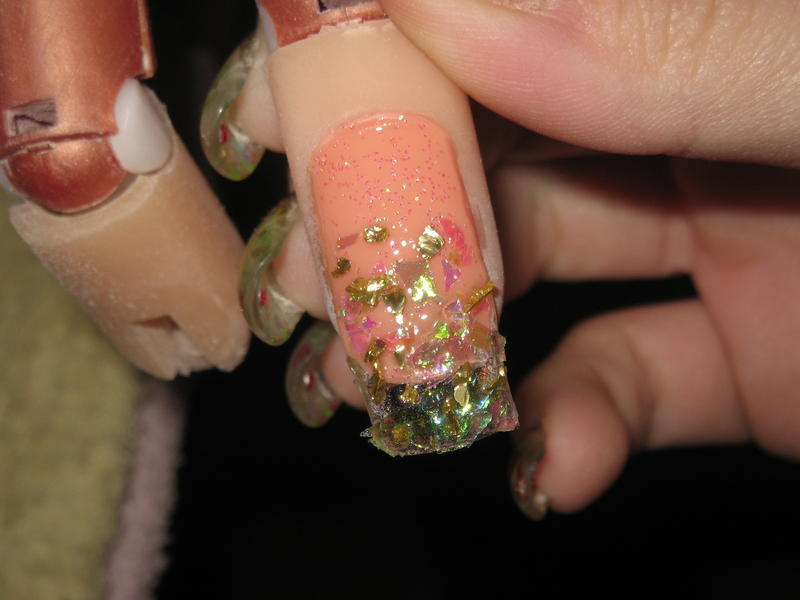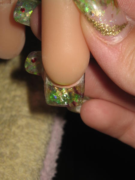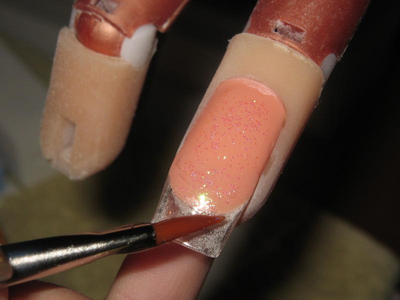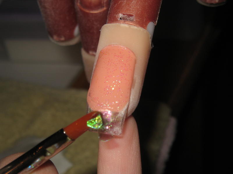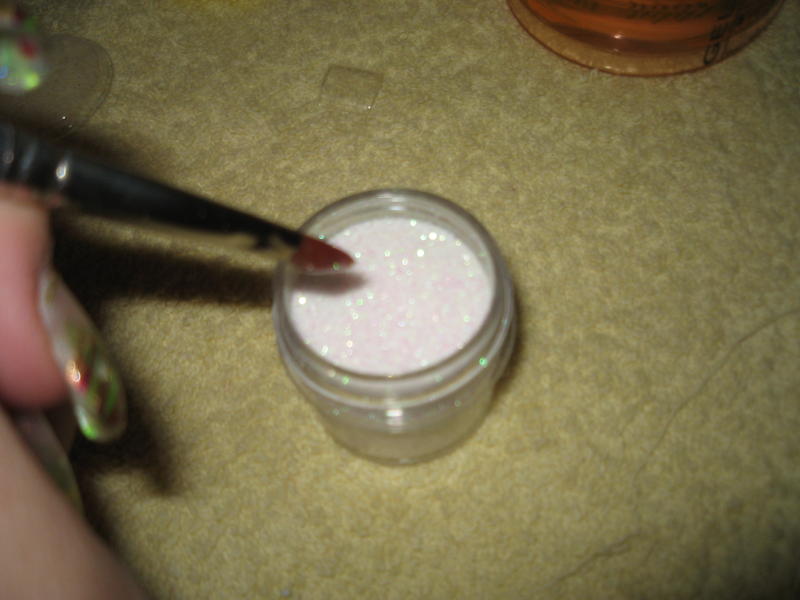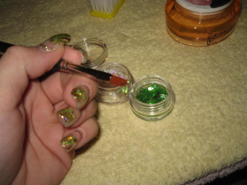 11- photo n°22 à 24: 2eme étape: garder un "peu" de gel sur votre pinceau que vous allez venir tapoter dans les paillettes et venez les déposer sur l'ongle (comme si vous appliquiez une couche de gel) puis catalyser