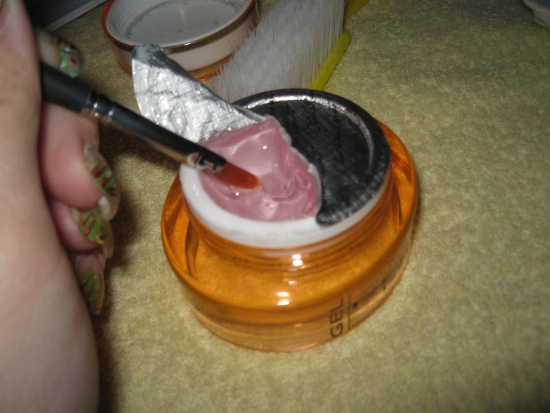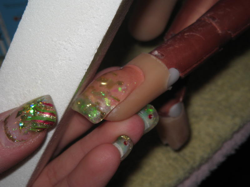 3eme étape: alors avant la pose des flocons il est nettement préférable et conseillé de venir reposer une fine couche de gel de construction pour une fois de plus faciliter la pose de nos décos (de plus ces entres couches donnent une solidité de plus à notre ongle...)