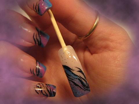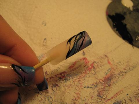 Je retire le ruban adhésif,....avec mon pinceau je viens finaliser doucement le rose au bleu pour obtenir un dégrader de mauve au rose (centre).
