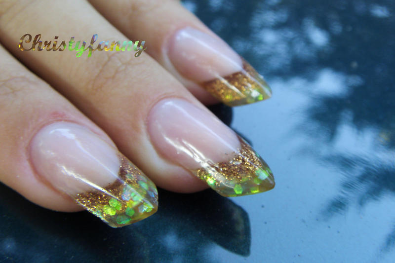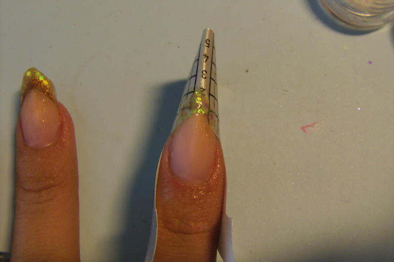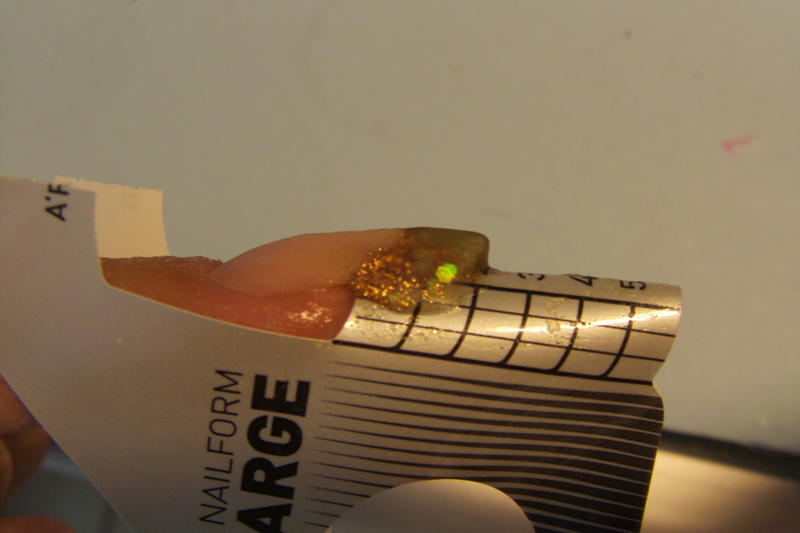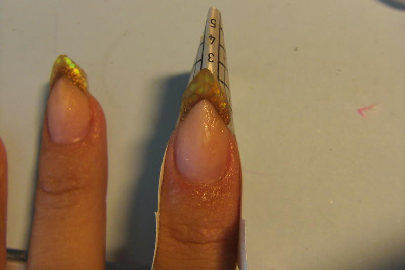 Pour la french je commence par prendre une boule de clear (mélangé a de la peinture vitrail couleur sable) que je trempe dans mes paillettes (blanche hollograme) je prolonge mon rallongement avec une fine couche pour donner la forme de la french