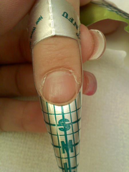 1- preparation de l ongle: desinfecter, pousser les cuticules, depolir l ongle naturel avec une lime douce, desydratant , primer et chablon