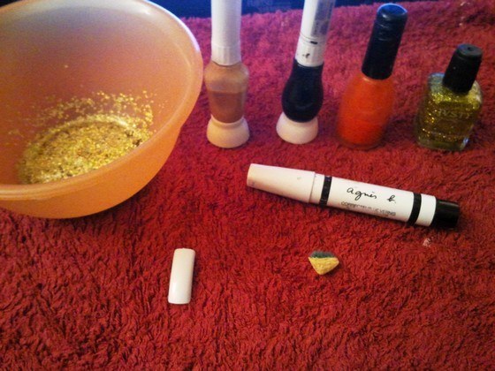 du Vernis Or , du vernis orange , du vernis pailleté or, un liner noir, des paillettes , un petit bou d'éponge , un stylo correcteur et du top coat .