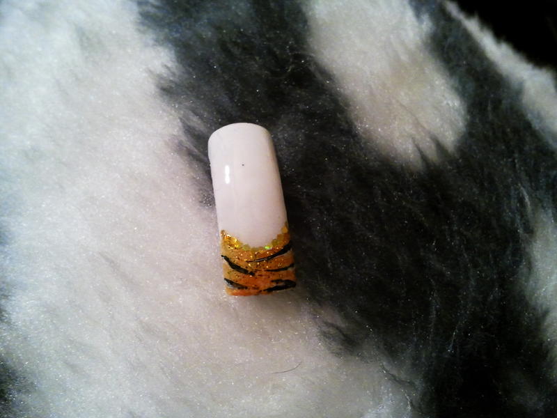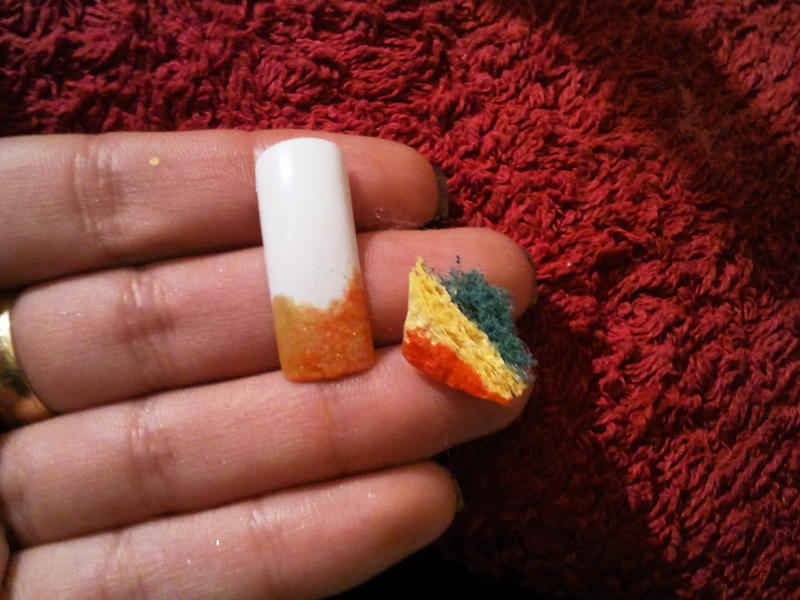 - Avec une petite éponge imbibé d'un peu de vernis orange , tapoter en biais en partant d un coin à la bordure du sourire tout en allant vers le bas