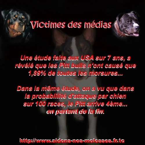 C'est vrai que la morsure d'un chien de catégorie 1 ou 2 sera plus grave qu'un caniche ou autres petits chiens , mais ca ne veux pas dire que c'est un chien qui va forcément mordre. C'est malheureusement ca que les gens pensent, "un pitt ou un rott mort, il est méchant". Les propriétaires de ces chiens on en a marre que quand ils promènent leur chien les gens changent de trottoire ou les regardent bizarrement. Et le problème c'est que les médias continu à afficher cette image de "chien méchant" à la télé, je pense qu'ils développent mal le sujet. Ils mélangent bons et mauvais maitres dans le même sac.
