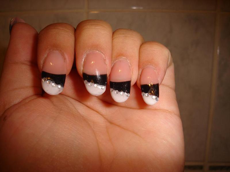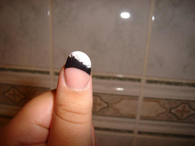 bah, gel couvrant, gel (ou peut etre vernis) noir et blanc, strass, gel de construction et chablon vu que y'a pas de capsules :)