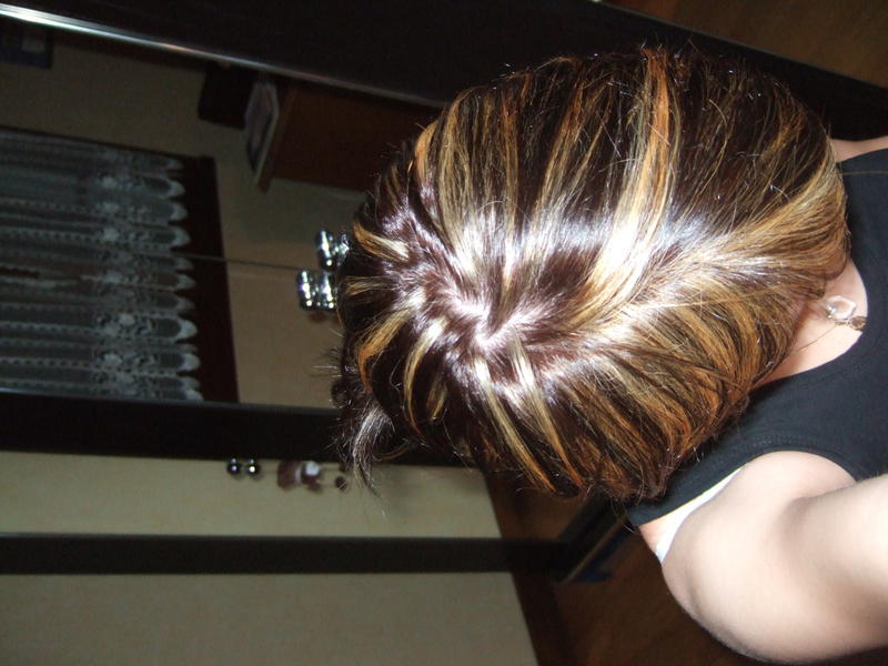 Voila c'est une sorte de balayage blond et des mèches un peu chocolat clair !!