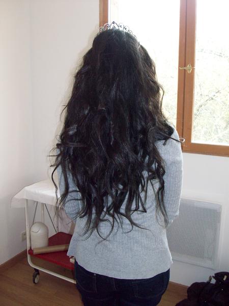 moi quand je suis une simple invite, je fais ma coiffure fetiche : raie au milieu, sorte de chignon haut avec une natte comme couronne (lol) et une cascade de boucles derriere