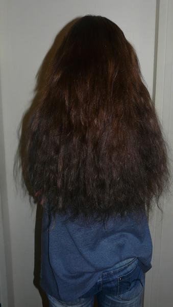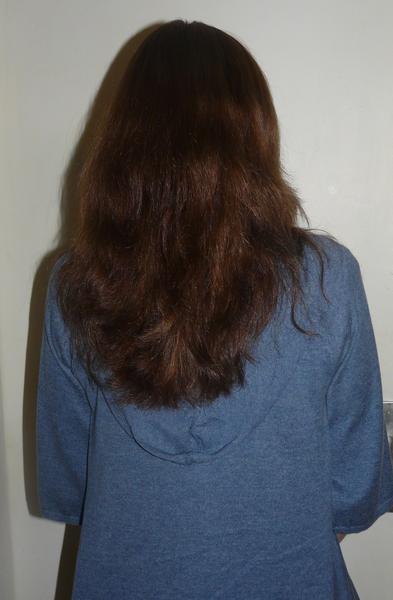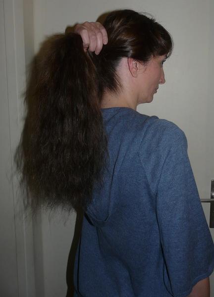 Une foto apres de dos (avant la coupe et le coiffage), une photo en queu de cheval avant la coupe et le coiffage.