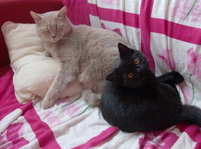 Alors voici Baloo le "beige" et Diddl le noir, deux British shorthair agés de 4 et 2 ans et pesant tous les deux aux environs de 8 kg.