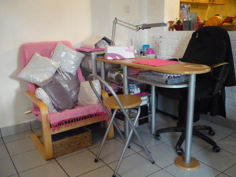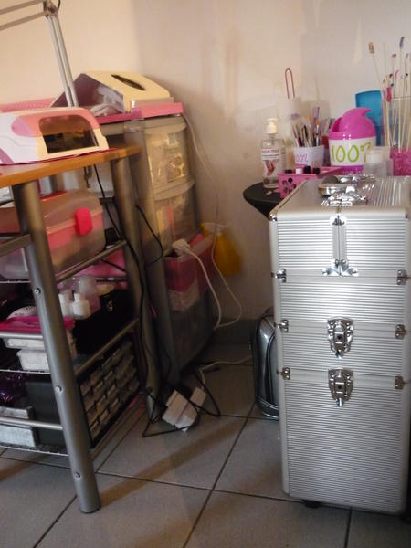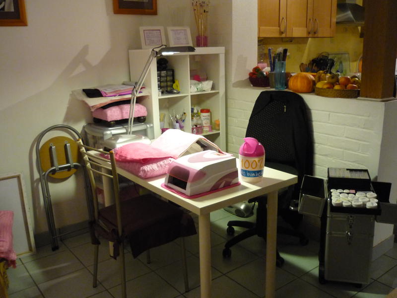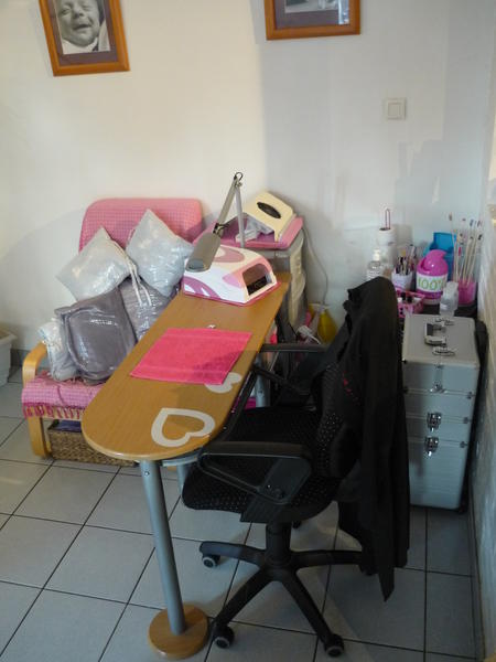 Coucou les filles ! Voila ma pièce spécialement créée pour faire les ongles ! Pour l'instant c'est du provisoire , donc j'ai essayer de créer un petit coin sympa pour mes modèles , et en septembre j'ouvrirais officiellement et la je vais faire une déco des murs en ambiance "zen" , c'est à dire chocolat et psitache , tableaux de galets , fontaine à vapeur avec des huiles essentiels , un petit vasque à installer pour le spa ... bref , ça va être top ! Voila donc pour le moment :