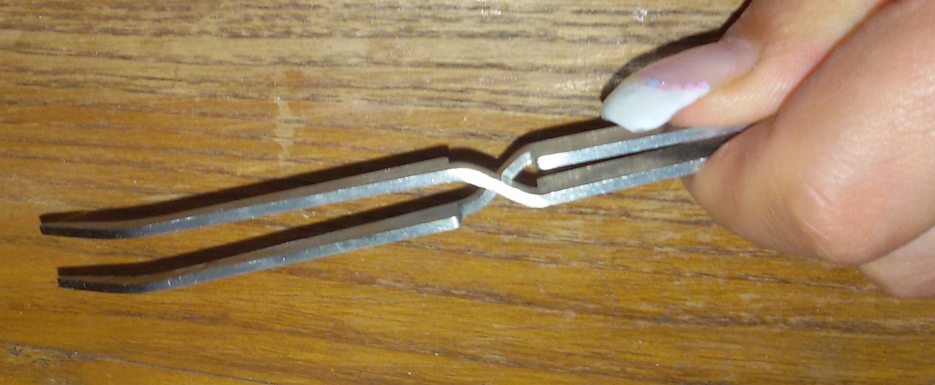 Une fois mon chablon posé, je fais mon gel de base tout ça tout ça, et je catalyse une vingtaine de seconde, là je dégaine ma super pince mieux que le colt de Lucky Luke et je viens la positionner au niveau de la zone de stress, pas besoin de forcer pour serrer, on sent très bien la pression qu'elle excerce et elle pince bien fort!