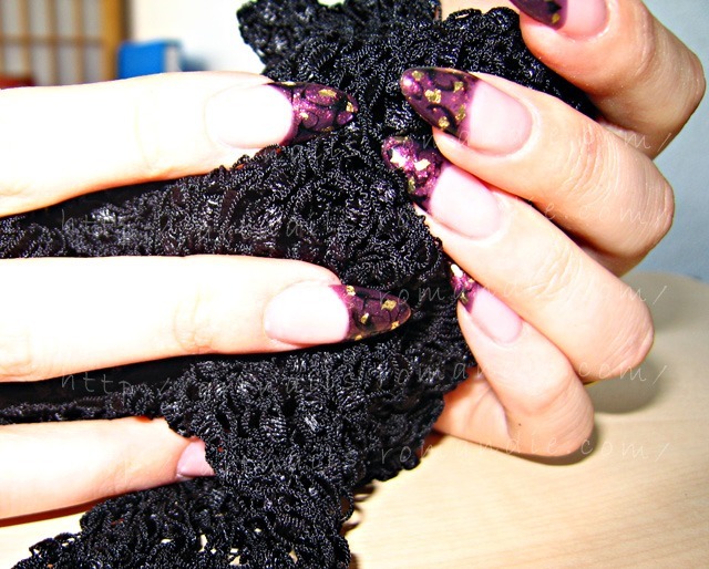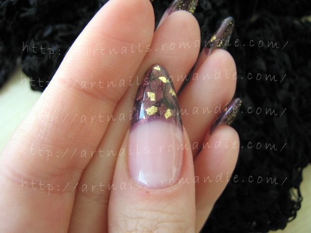 La déco french marble au vernis Prune scintillant et noir, ainsi que feuille d'or.