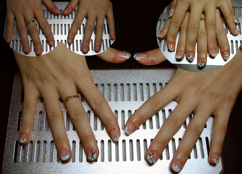 Premier essai de pose arrondie sur les doigts martyrs de ma petite soeur (aux chablons cette fois).
