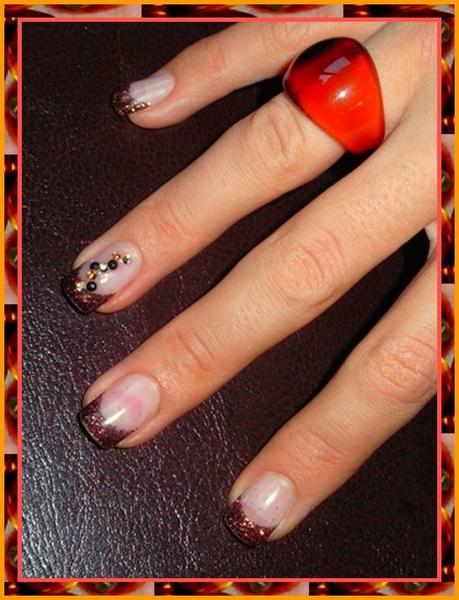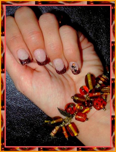 Ma cliente avait envie d'une pose automnale donc je lui ai mis des paillettes chocolat de profesionails et une descente de strass dans les tons de dorés, noirs et orangés sur l'annulaire gauche et l'auriculaire droit...