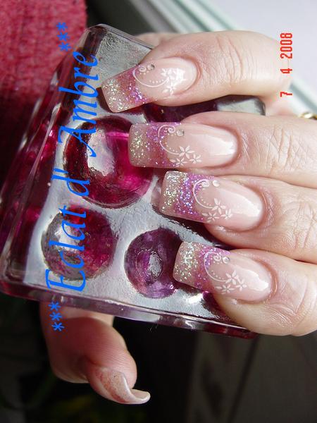 Voici ma new pose to en paillettes violette et blanche, ralongement de plaque, tampon konad fleur blanche et strass argent.