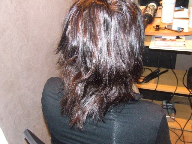 Vous avez donc l'avant , l'après , et l'après lissage et coupe, ma cliente n'étant pas très grande on n'a pas voulu conserver la totalités de la longueur , et elle ne souhaitait pas une coupe effilée avec coupe en V ( snif j'adore couper en V mdr )