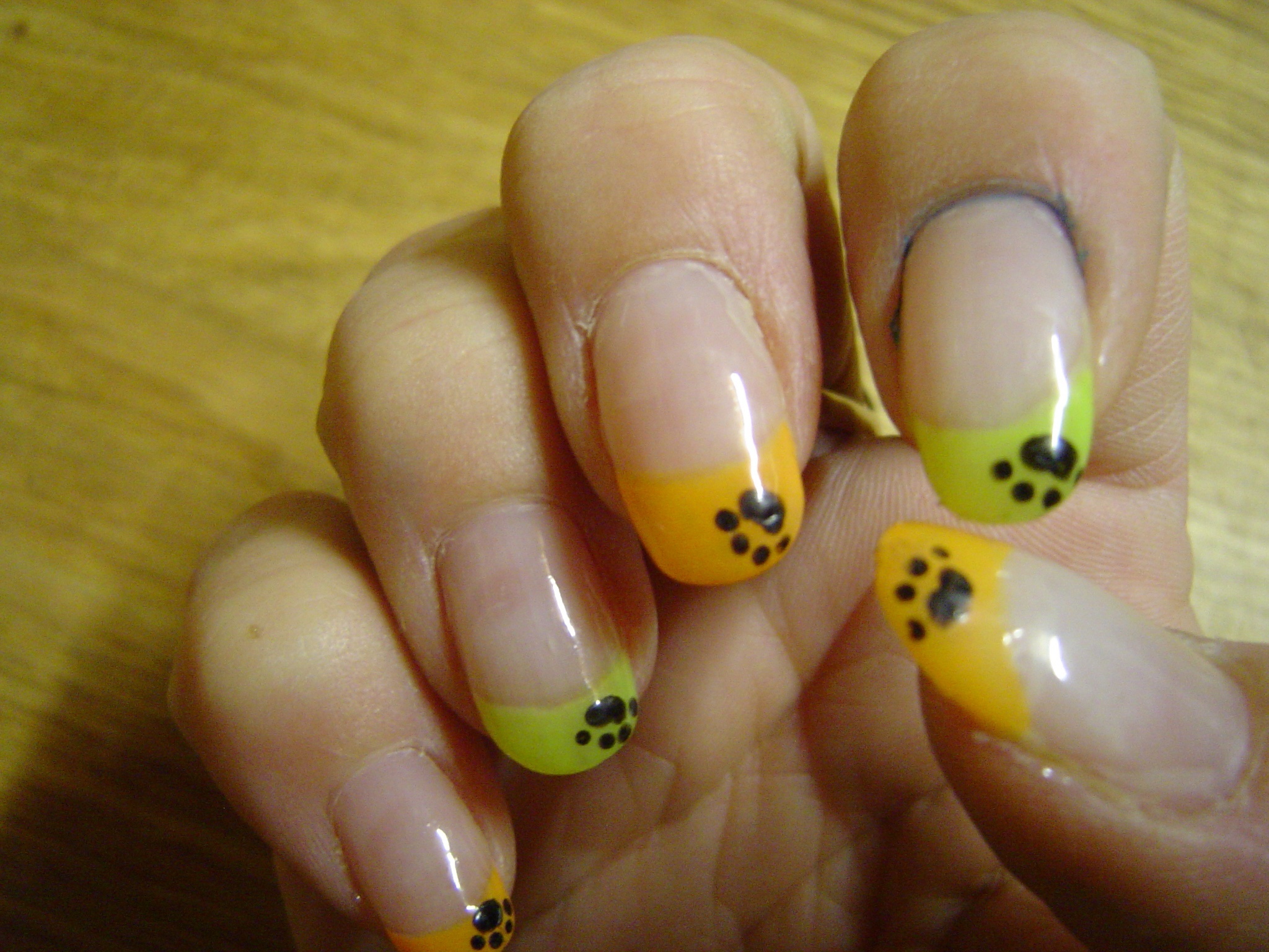 :mdr: bon les filles je vous raconte tout::wink2: :wink2: french c'est au vernis fluo et les pattes de chat c'est avec le spot:mdr: :mdr: la petite boule et du liner ou acrylique ou vernis......................:thumbup: :thumbup: :thumbup: