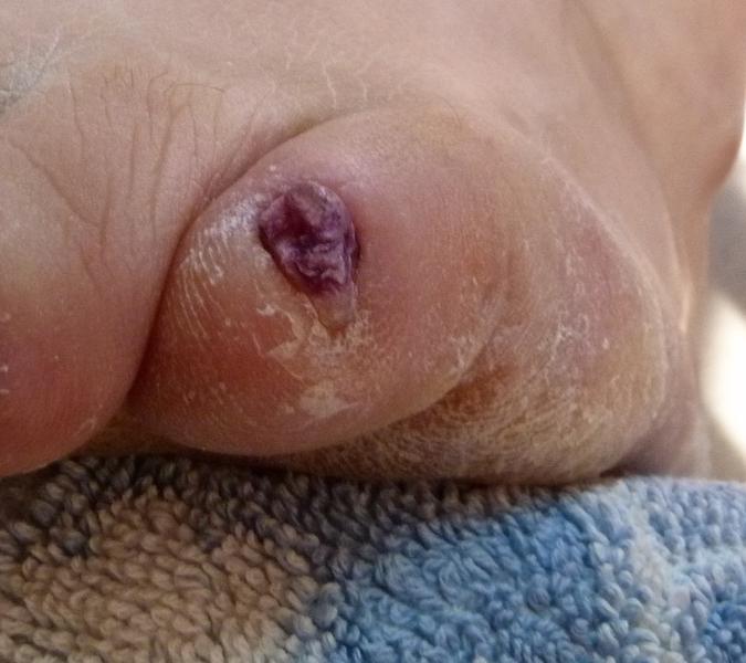 Il faudrait que tu arrive à lui faire une papillotte avec de l'acétone autour du petit doigt de pied pour enlever le vernis et voire la couleur réelle de l'ongle.
