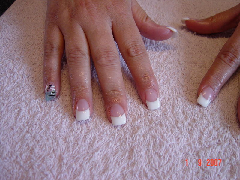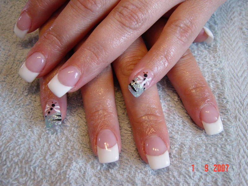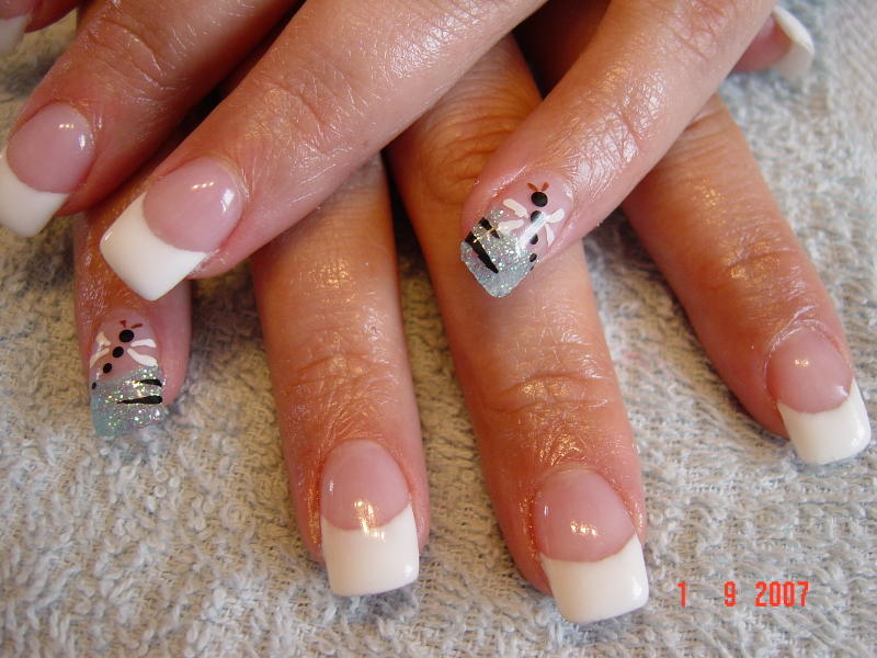 *Pose avec extention d'ongles au chablon, french blanche et petit doigt libellule sur fond paillette bleu.