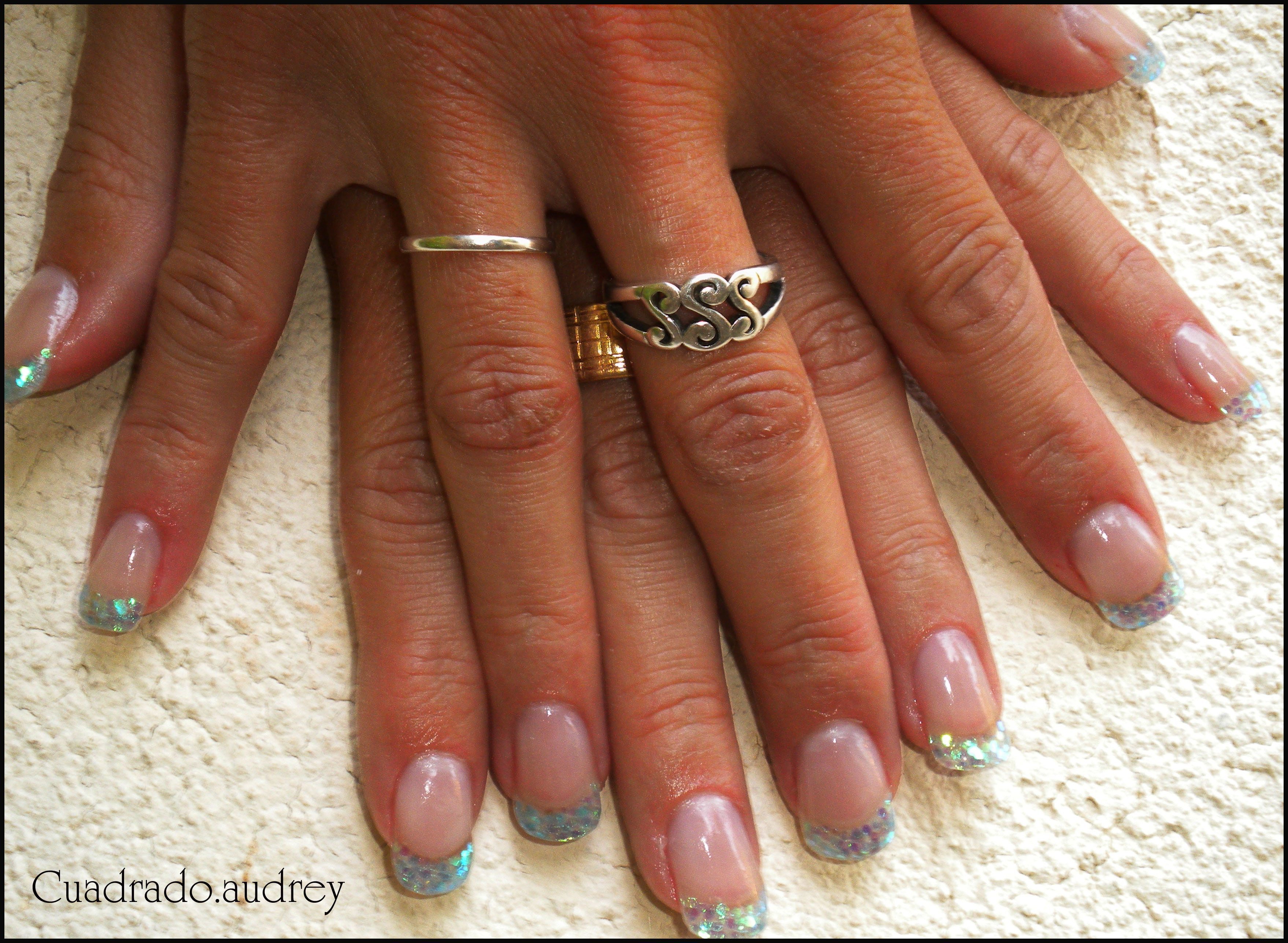 Pose sur ma soeur qui voulait un guout d'été donc voila ralongement chalons et french pailette turquoise de chez gel uv discount u en cadeaux ^^