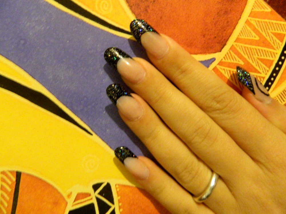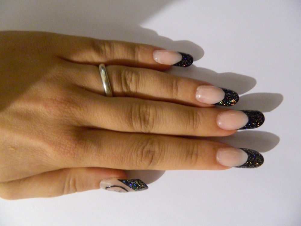 pour la blanche j'ai poser mon cover en 1er et french ensuite en suivant le cover et pour la noire c'est la même pose j'ai juste fais ma french au pinceau avec un vernis noire et par dessus vernis paillettes.
