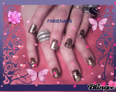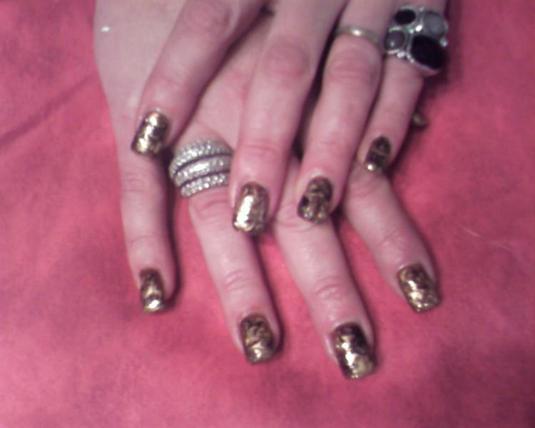 je viens de terminer mes mains j'ai fait 1 marbré marron avec or et noir avec touche pailletée or, a vos coms les filles....