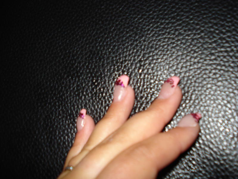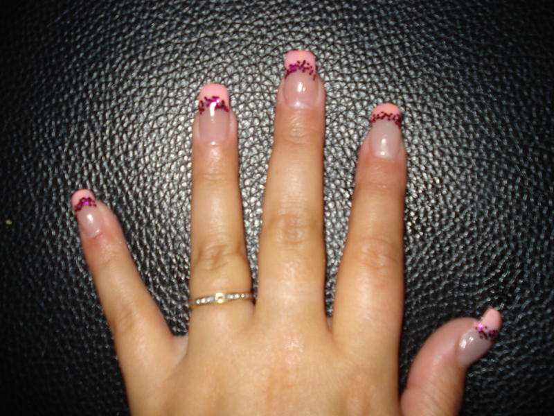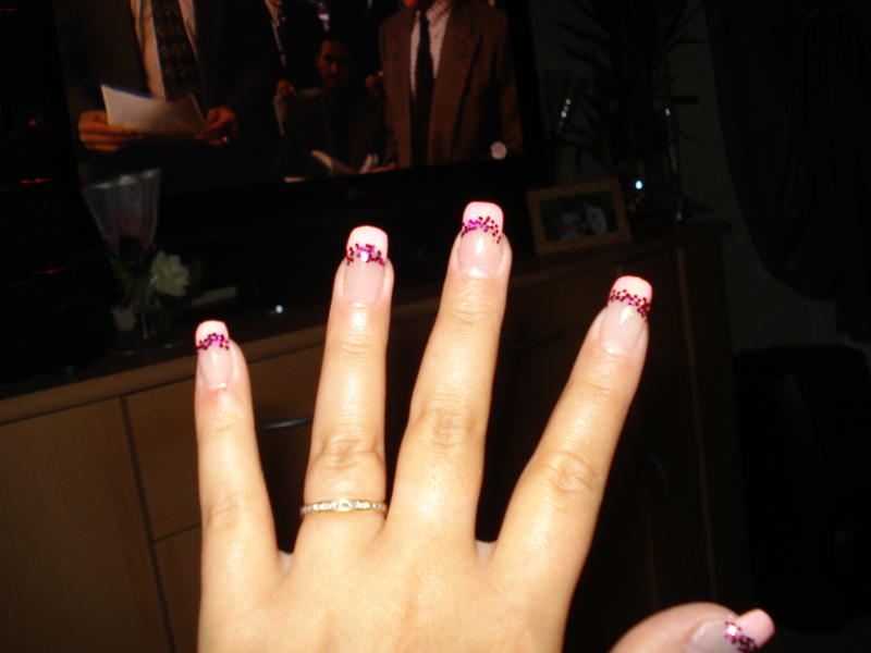 Voila la pose que jme suis faite tt a lheure sur moi meme. Mon tt 1 er rallongement de plaque.....loool Donc french rose au flexbrush et pailettes.