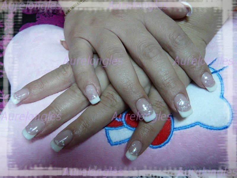 pose en gel, rallongement au mask onglerie.be, french blanche azkentz, nacres blanches onglerie.be et paillettes mauves (qu'on voit pas dailleurs :twitcy:) construction easy2 onglerie.be, et finition quick finish ongle24