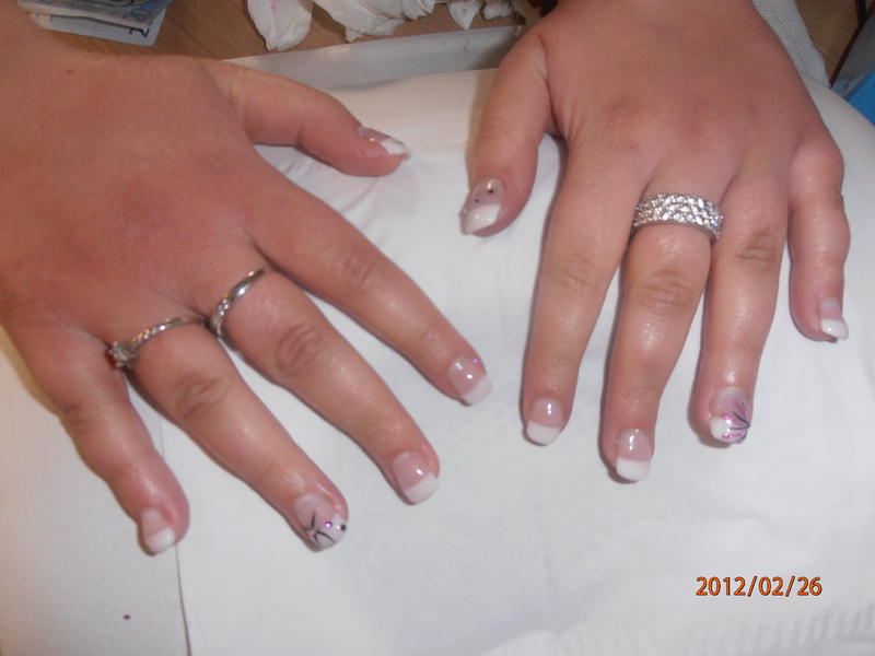 alors un peu trop de matiere sur certain pas assé sur d'autres french inegal et parallele attention a pas toucher les cuticule avec le gel , bon début ! attention ne pas poser trop long sur les rongeuses car souvent au debut les casses sont frequente car elles n'ont pas l habitude