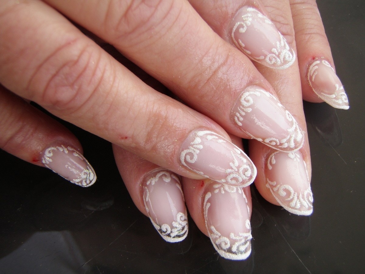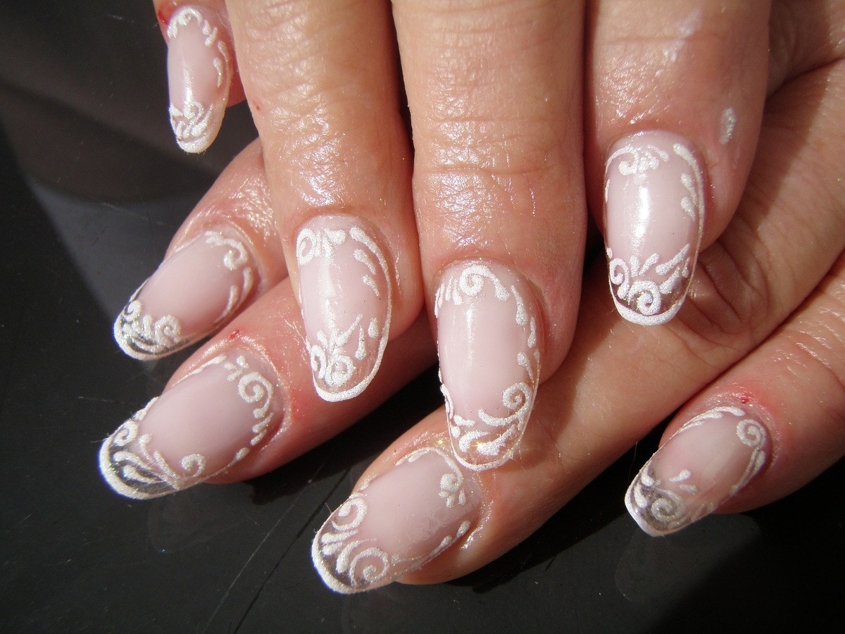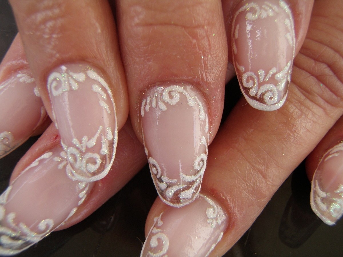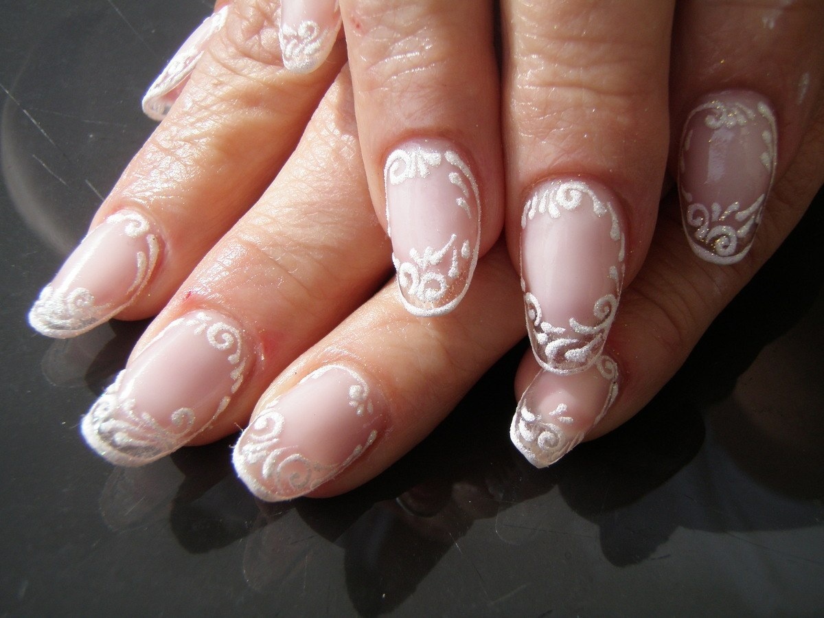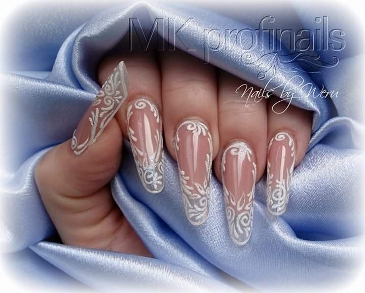 Coucou les filles voici une de mes dernières poses avec rallongements chablons, rallongement de plaque puis design au gel one stroke avec paillettes blanches.