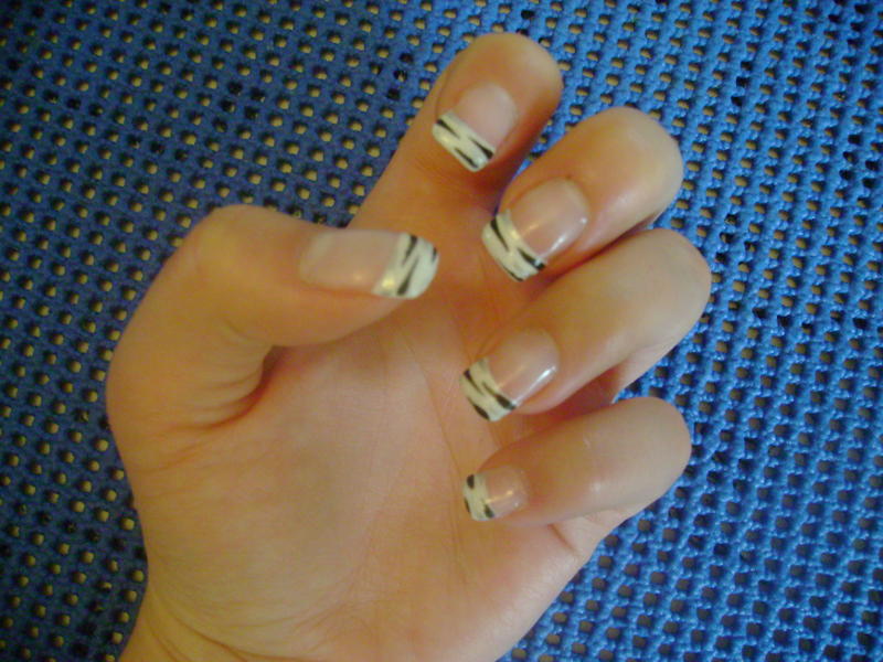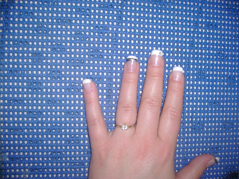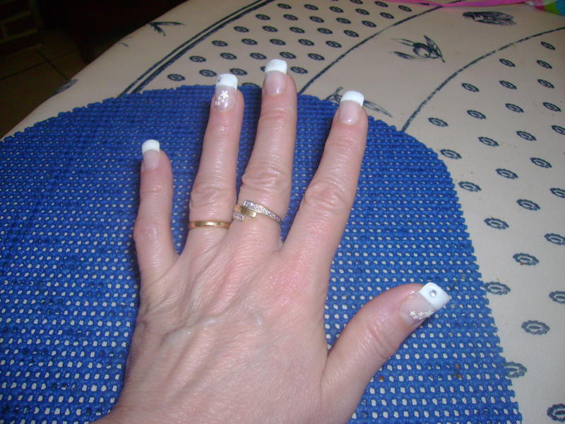 alors les défauts; y'a pas assez de bombé donc l'ongle rebique, la french est trop haute donc on voit le bord libre, et il faut relimer certains cotés car ca part en patounettes
