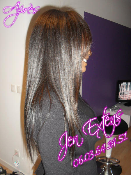 La premiere sur cheveux Afros Défrisés 100 mèches du Paradis des Femmes couleur 1B et qques mèches en 2 en dessous et autour du visage
