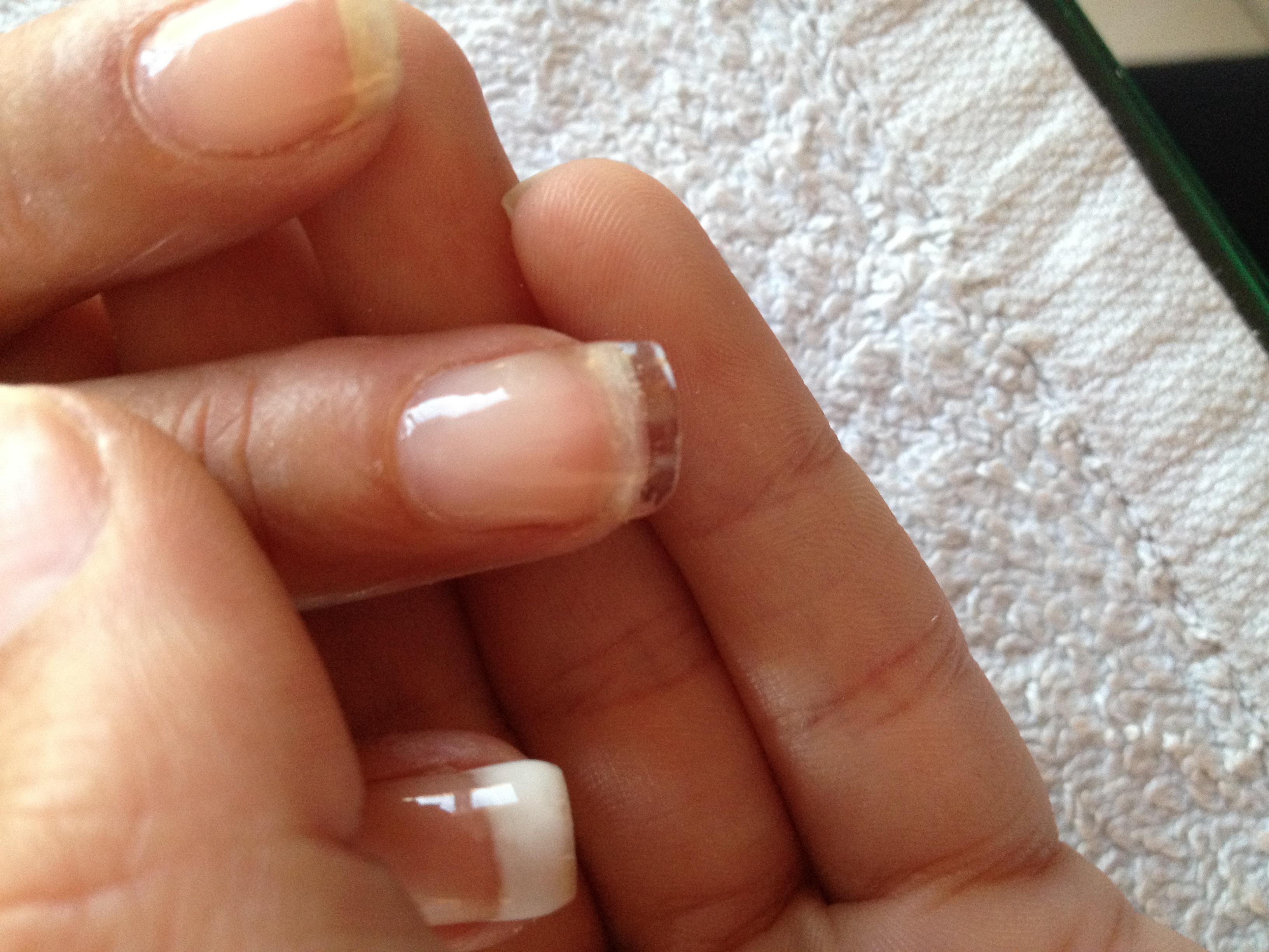 et le resultat : un decollement sur le bord libre de l'ongle, mais uniquement sur les pouces , index et majeurs ...