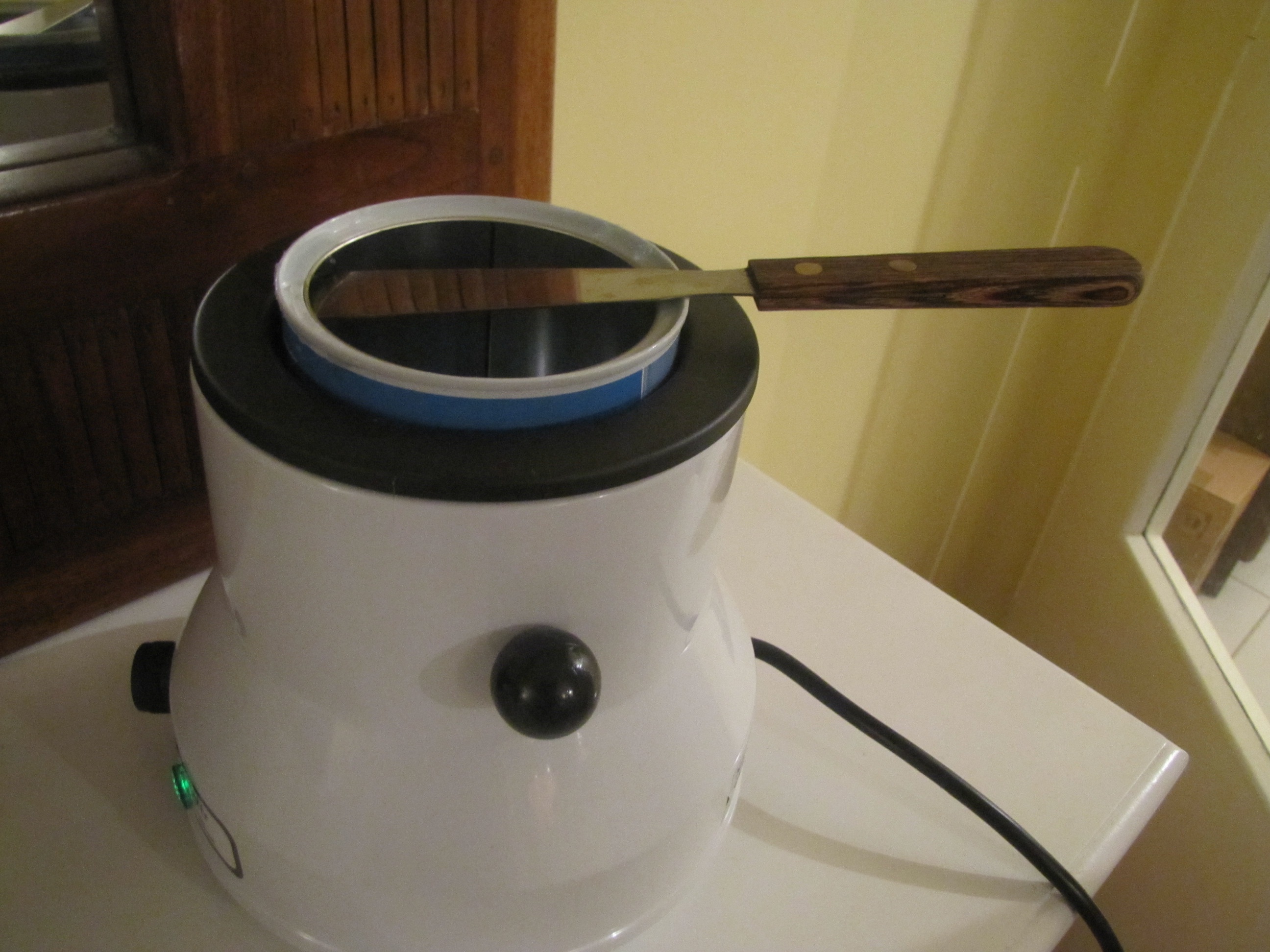 Pour ne pas salir une coupelle ou un repose-spatule, il suffit de mettre la spatule sur la coupelle de telle maniere que c'est une partie sur laquelle il n'y a pas de cire qui soit en contact avec la coupelle ou le repose-spatule. Cela montre l'importance de ne pas trop tremper la spatule dans la cire pour que la plus grande partie de la spatule soit totalement dépouvue de cire.