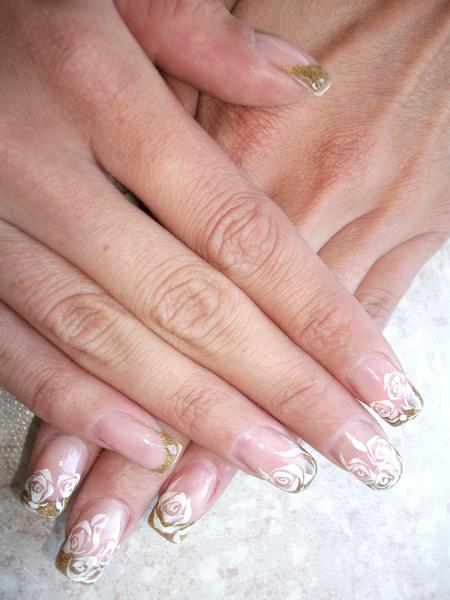 sur le coup en ouvrant la photo j ai trouvé ta pose un peu chargée, et puis en la regardant mieux, ces roses blanches sur un fond d' or, meme sur tout les doigts, c est ce qui fait le charme de ta pose.