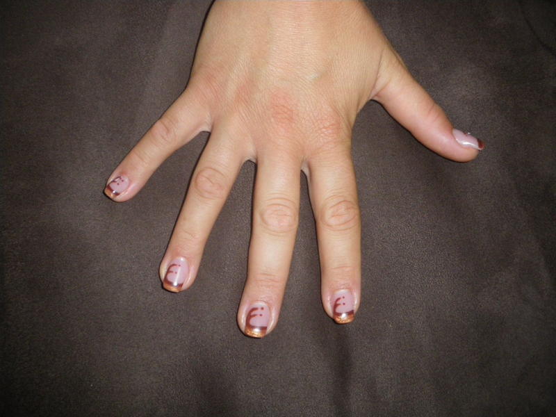La 1ère honnetement j'aime pas trop! Je voulais tester une french couleur avec une petite déco alors, j'ai fais un petit essaie juste sur un doigt je voulais le retirer mais ma cousine m'a dit que ça lui plaisait alors elle m'a demander de lui le faire sur tout les doigts voila pour la petite histoire je vous laisse juger vous meme!!!