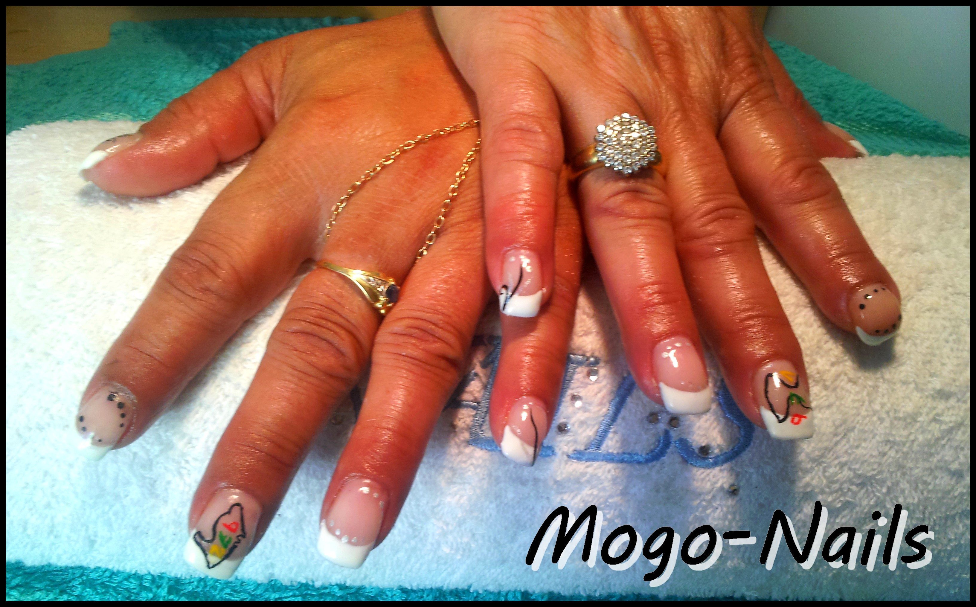 Photo 4 : Pose french avec la carte de la martinique et celle de la gwadeloupe (vas'y pour dessiner ça ..) mais c'est plutôt pas mal, accident sur l'index, ne travaillant qu'au capsule pour le moment, je n'ai rien poser dessus mis à part du gel, [ auto critique: french trop épaisse comme d'hab, j'les faite au dessus de la constru]