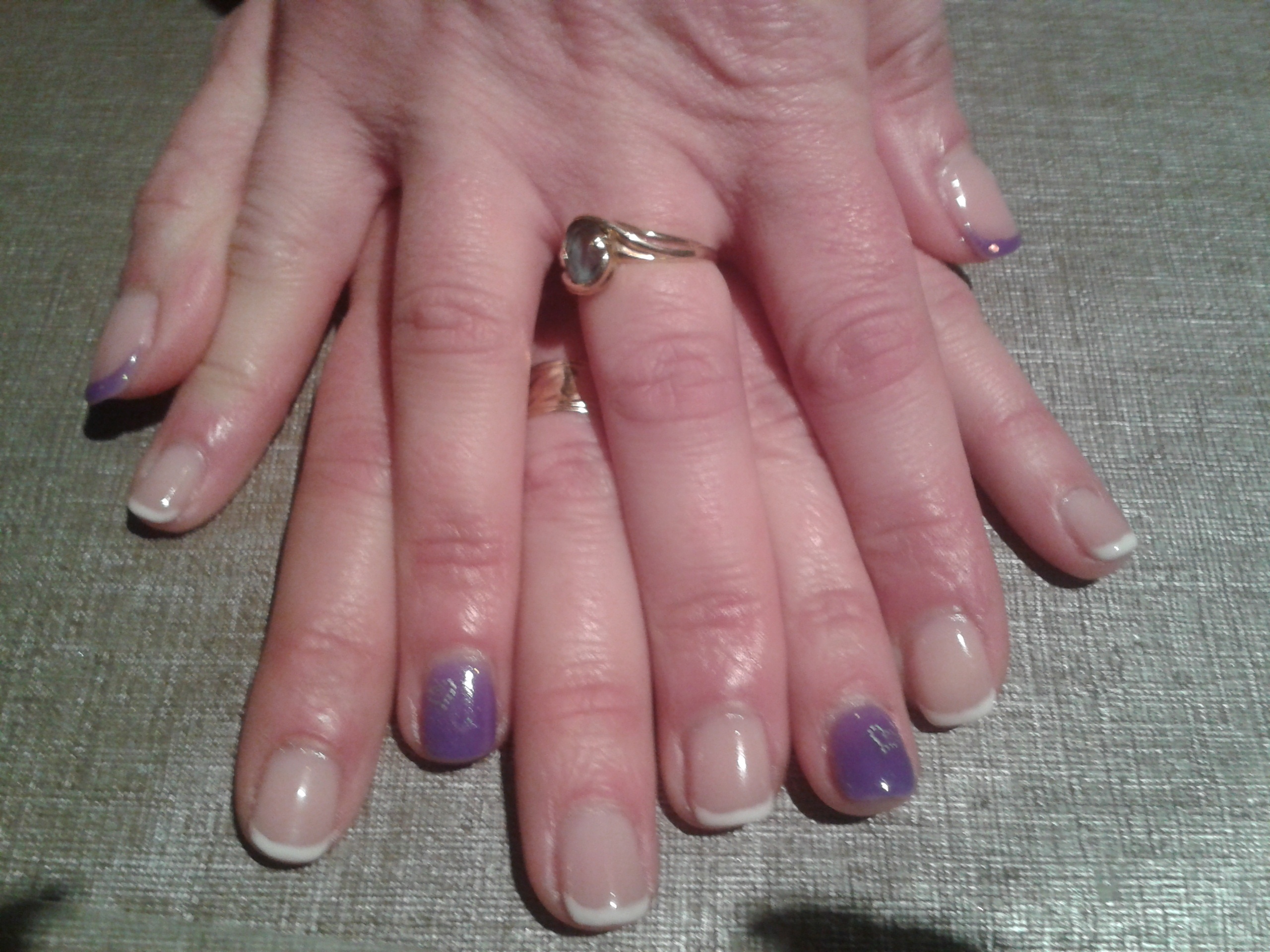 Alors, c'est un gainage acrogel car ses ongles étaient très fins et mous, et ensuite toute petite french au VSP (la galère pour faire une french aussi petite !!!). Pour les french des pouces et pour les annulaires, c'est acrogel et poudre acrylique (mélange de couleurs fait by me