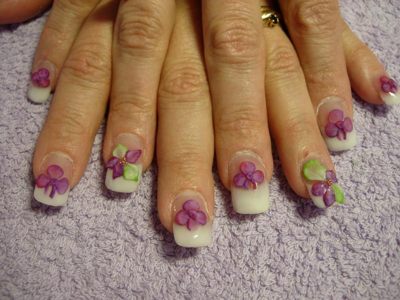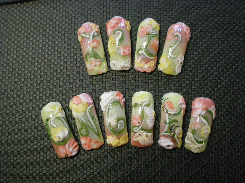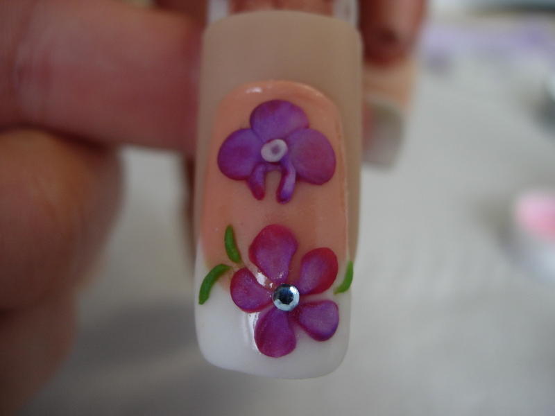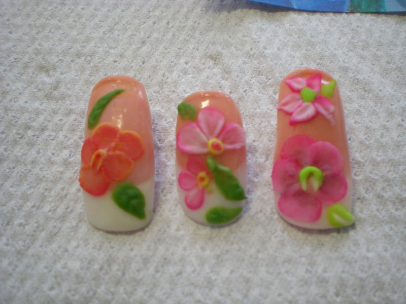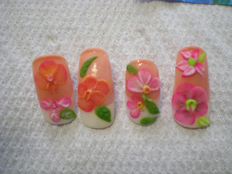 elle a fait bcp de progres pour qq'un qui n'avait jamais fait de resine, voici une pose complete avec 3D a tous les doigts, c son modèle ,aucun support, avec ses petits defauts!c normal!! c pas facile de faire des fleurs régulieres sur touts les doigts, mais je trouve qu'elle s'en est super bien sortie!!