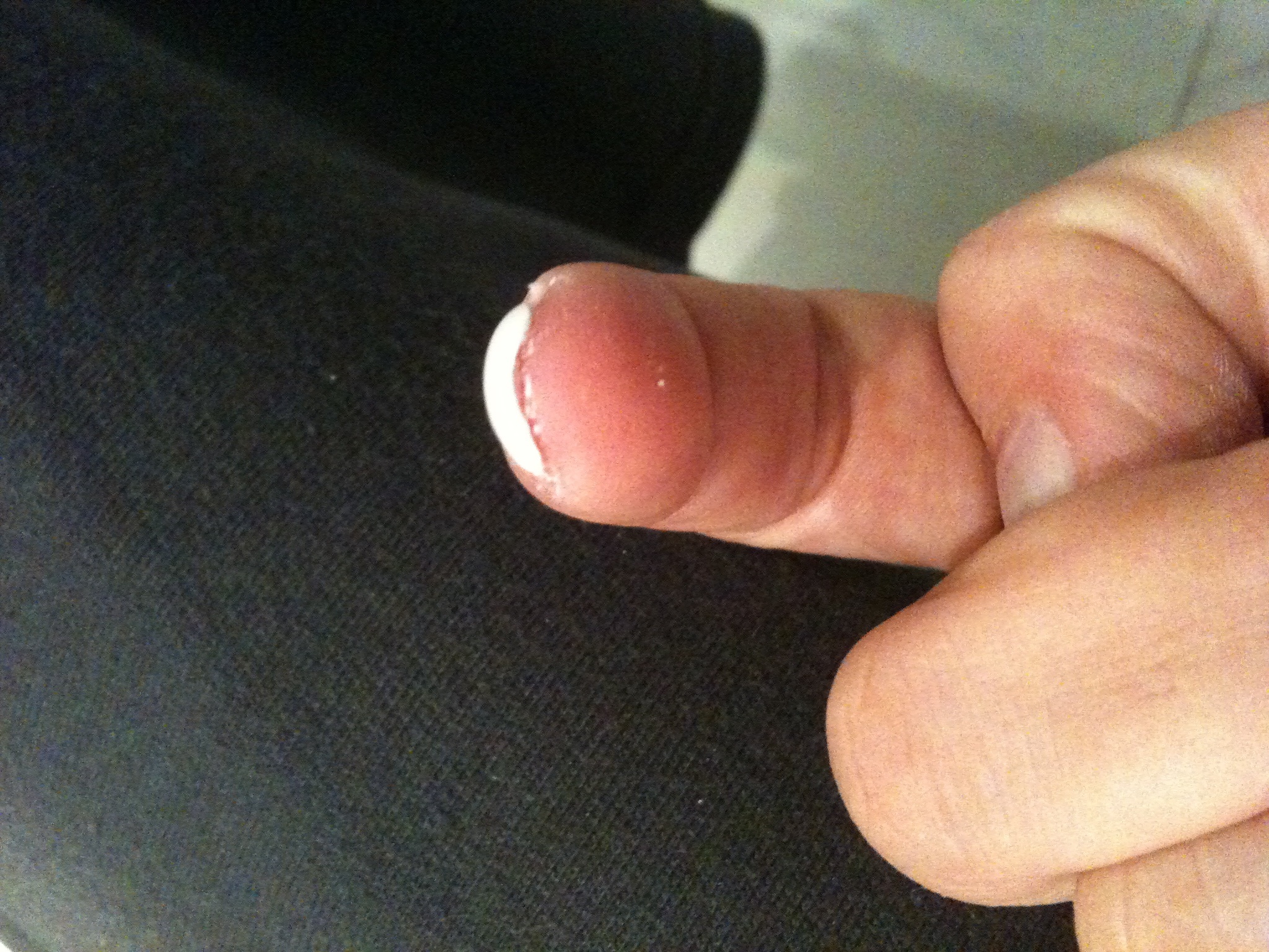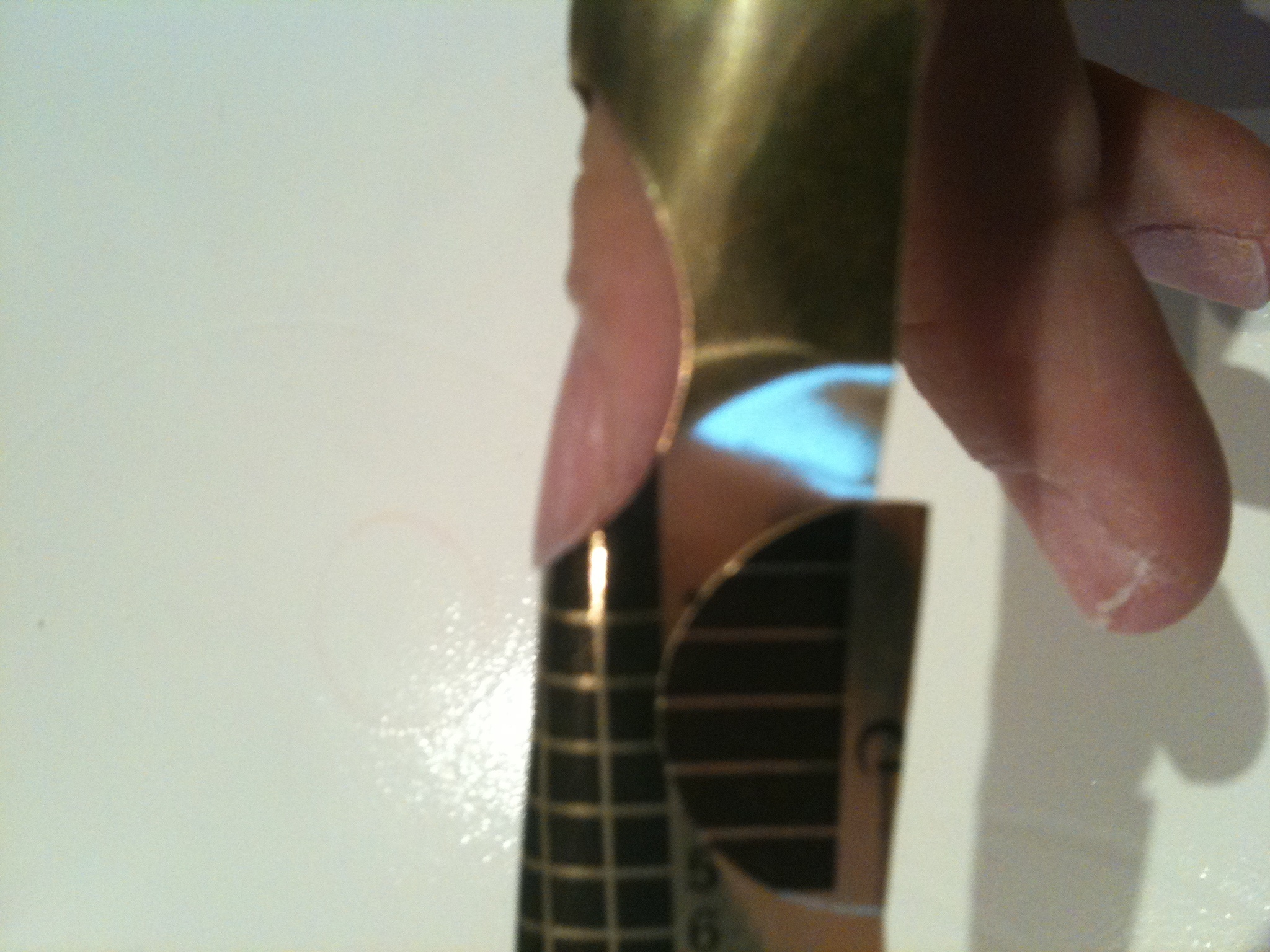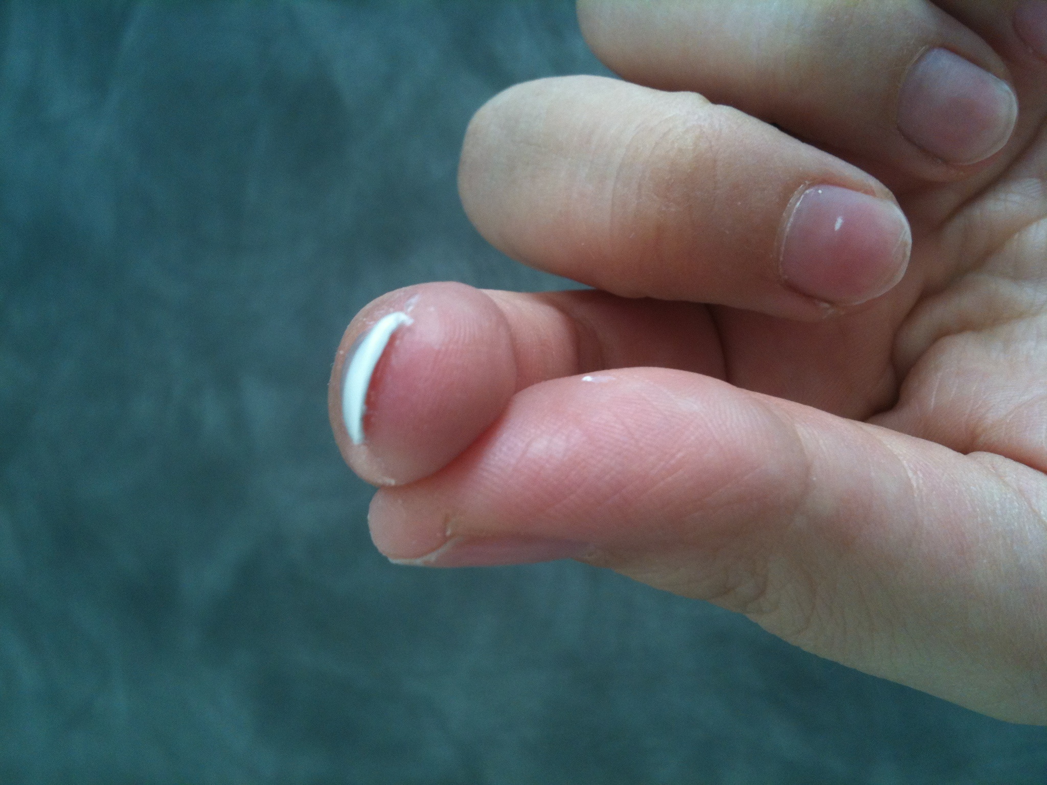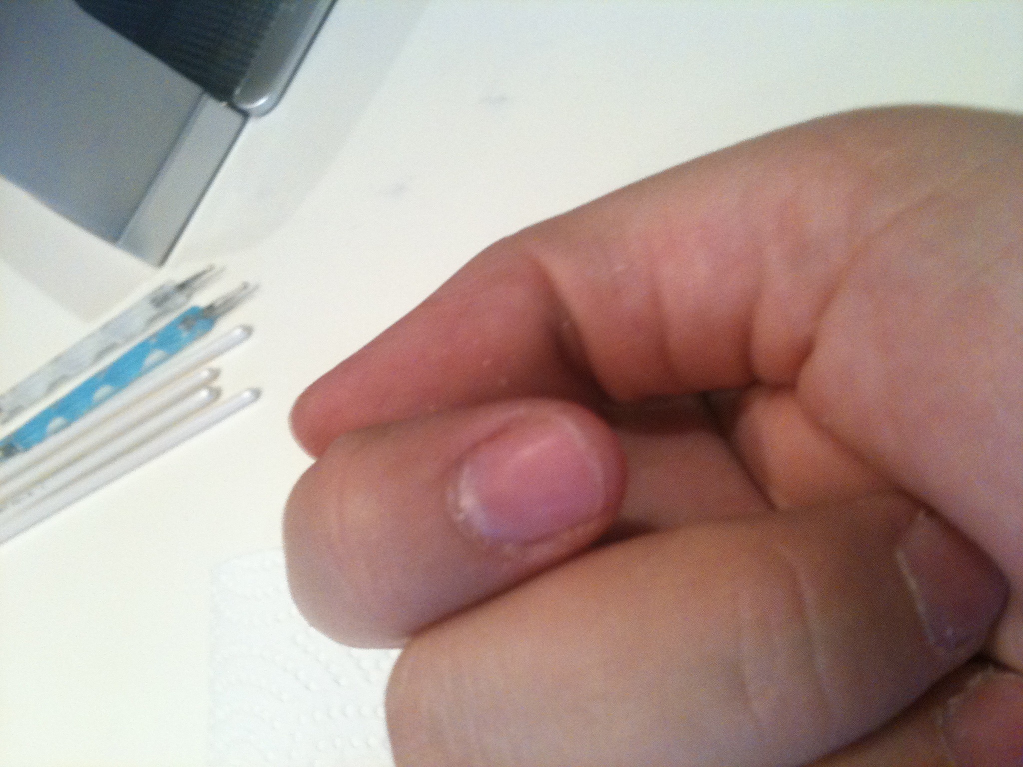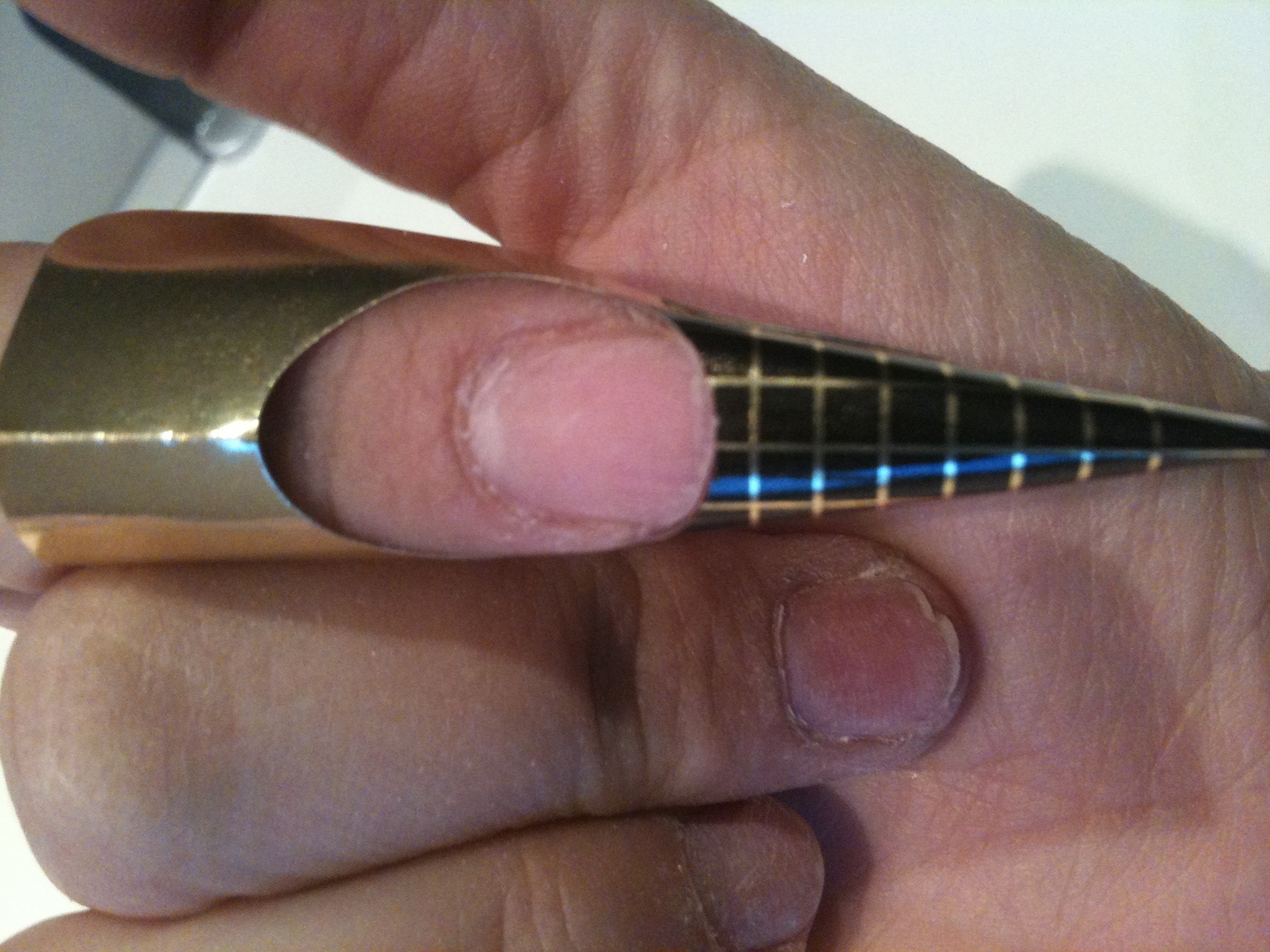 Pour le chablon je l'ai "glissé" entre l'ongle et la peau, mais l'arrondi de mon doigt est plus prononcé que celui du chablon. Je vais tenter de m'expliquer :) : au milieu du doigt le chablon est mis entre la jointure de la peau et l'ongle (limite à décoller l'ongle), alors que sur les extérieurs il y a un léger "vide" entre l'ongle et le chablon (même pas 1/2mm).