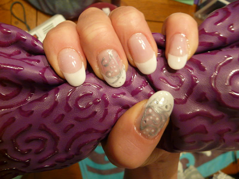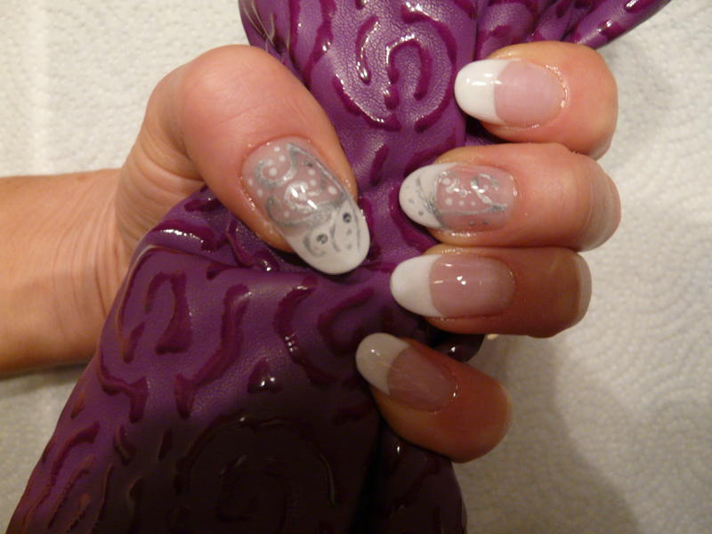 concernant la pose: j'ai utilisé des capsules naturelle, j'ai fait la french et pour la déco, j'ai utilisé du gel argenté de chez ryd nails et du blanc de la french plus pose de strass sur le pouce.