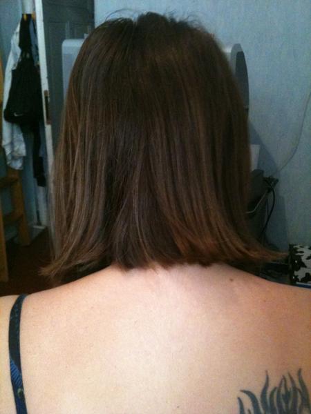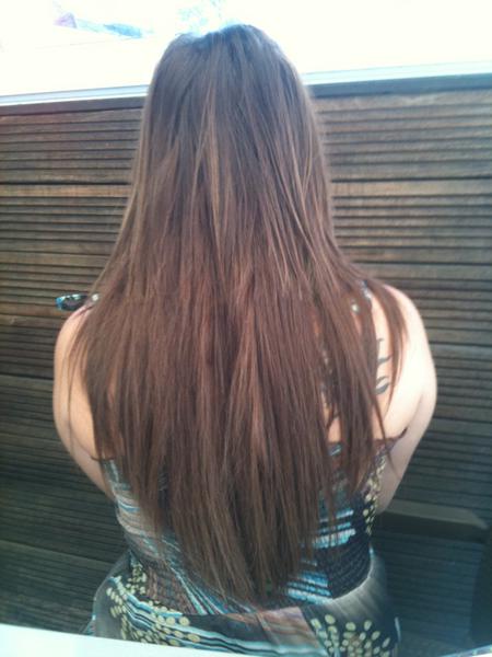 Coucou les filles alors mon modèle est allé chez le coiffeur pour effiler ses cheveux (car elle avait un carré droit et épais) et il lui a dit que c'était très bien posé, je suis plutôt contente :) le seul problème c'est que je n'ai pas posé assez haut :s c'est pour sa qu'il y a encore la démarcation du coup il a pas voulu toucher donc je vais lui rajouter des mèches et elle ira faire sa coupe une fois les mèches du haut posé