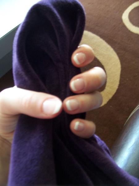 Voila je me suis lancée, j'ai acheté un kit et quelques produits et voici ma première pose!! (sur les mains de ma cousine) bon biensur c'est vraiment pas top top... :31-oops-sorry: