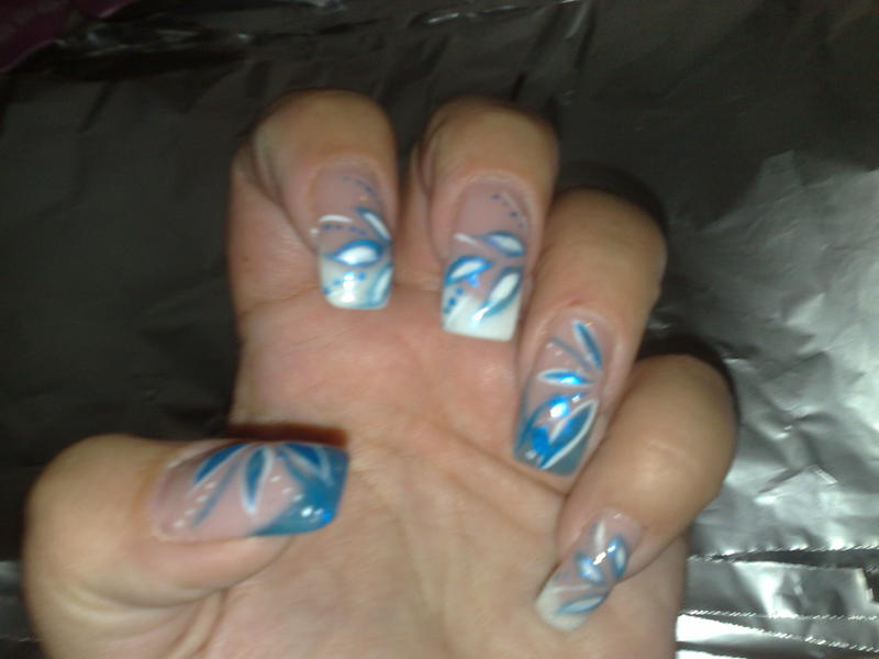 pose au chablon sur 4 ongles (bleu) et capsules sur les autres refait le rallongement de plaque avec le mask puis pour faire la french sur chablons en vitrail BLEU et french blanche naturel avec un gel french epais (pour lui refaire revoir chablons et capsules)
