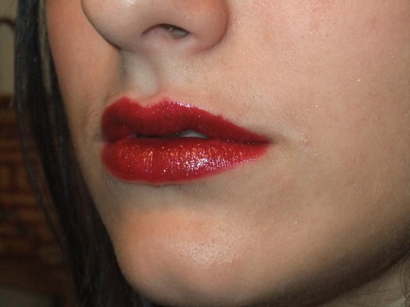 Les lèvres rouge avec des paillettes dorés mais on ne les voie pas trop!!