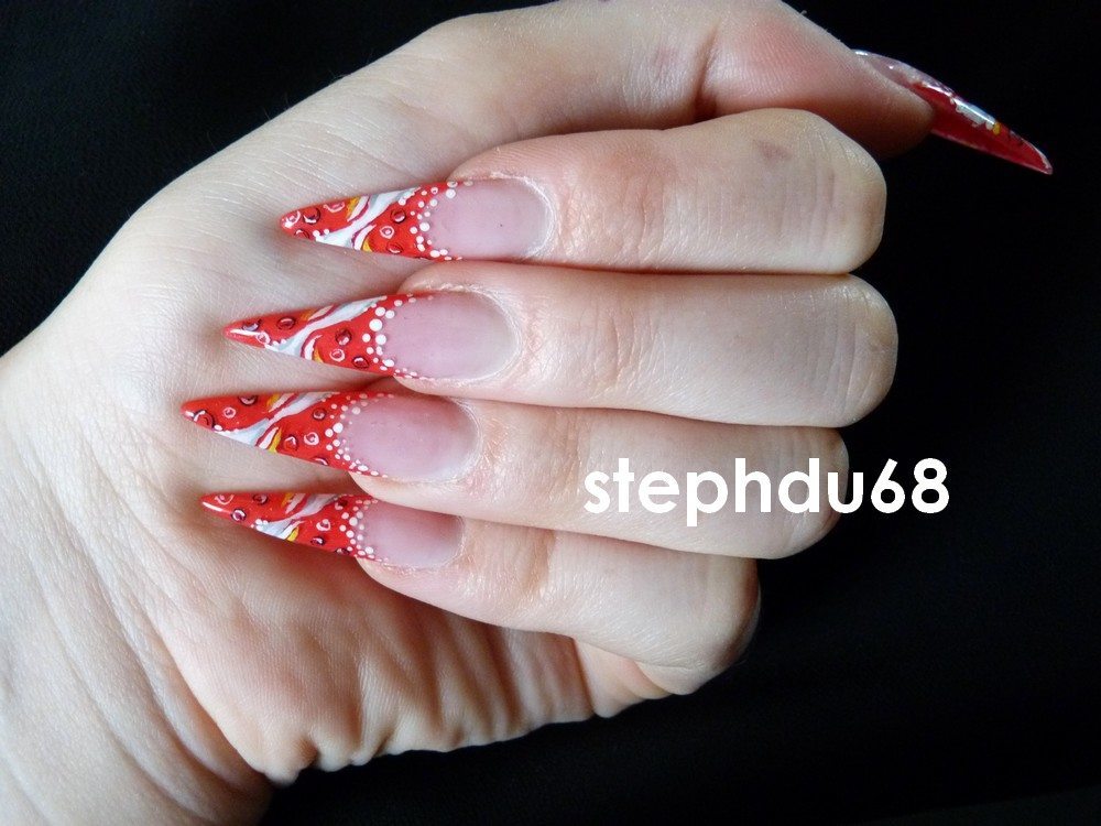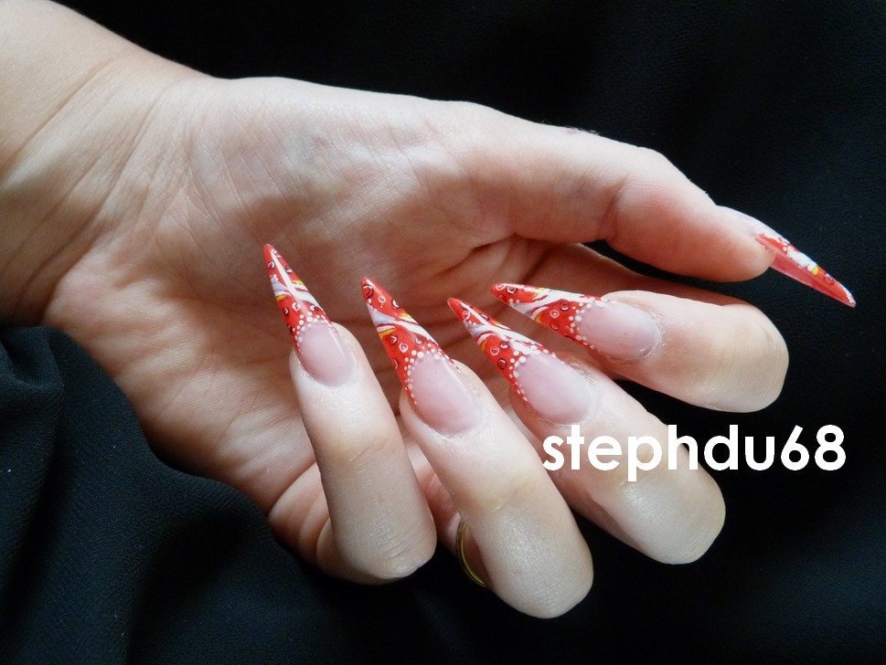 Voici mon premier essai de stylettos sur moi en version coca cola (pas à pas déco trouvé sur le forum).